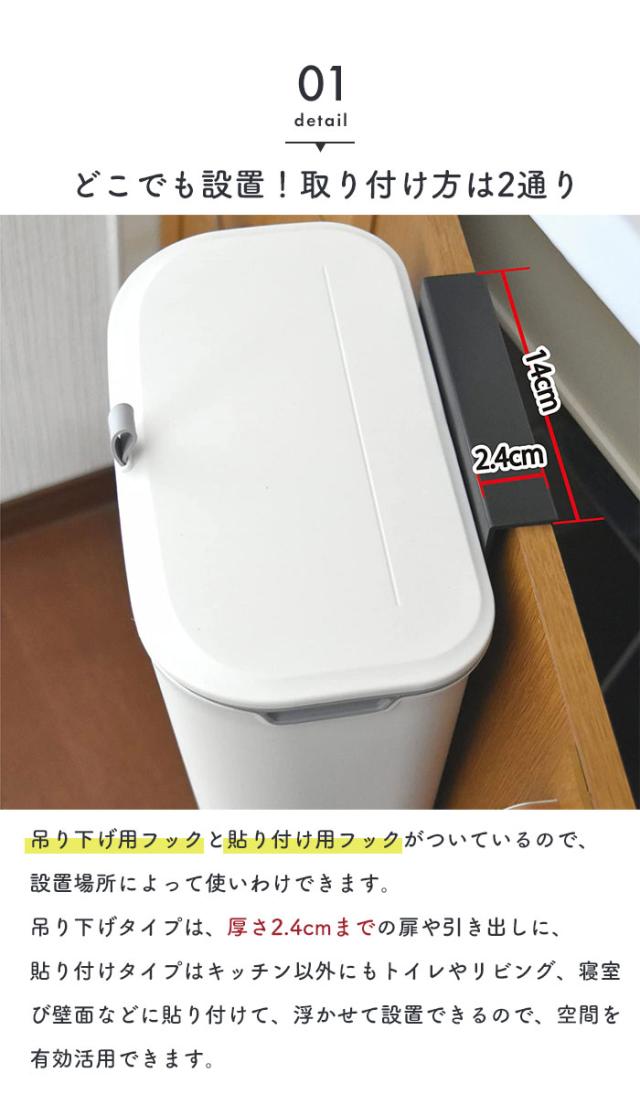| 調理中に出た野菜くずなどをその場でポイ。 流し台の扉や引き出しに掛けて使用できる便利なゴミ箱。 蓋付きでゴミも見えずニオイも防ぎます。 引っ掛け脱着式なので、ゴミが溜まったらサッと取り出して捨てられます。 吊り下げ用フックの他に、強力な貼付け用フックも付いているので、スチール製の家具や冷蔵庫など丈夫な壁面に貼り付けて取り付ける事も可能です。 蓋はスライドダウンさせる方式なので前方に軽く引き下げるだけ。 蓋が上に飛び出さないので、ゴミを捨てる際に邪魔にならず紛失も防ぎます。 また、ちょっとしたゴミは、ツマミをつまんで上に引き上げて捨てる事も出来ます。 ゴミ袋ホルダーが付いているので、ゴミ袋が見えないスッキリとしたデザイン。 |