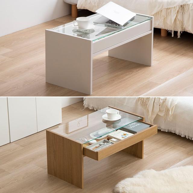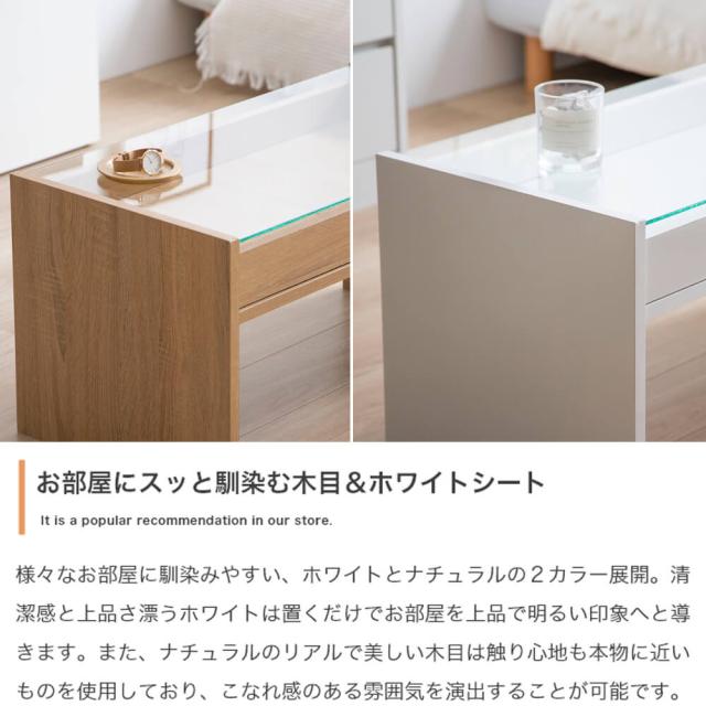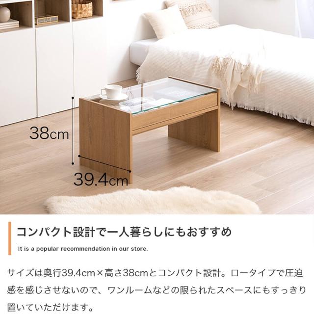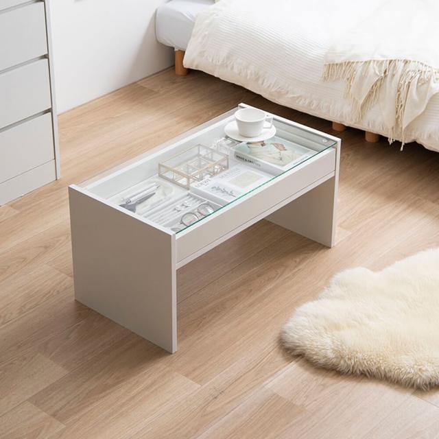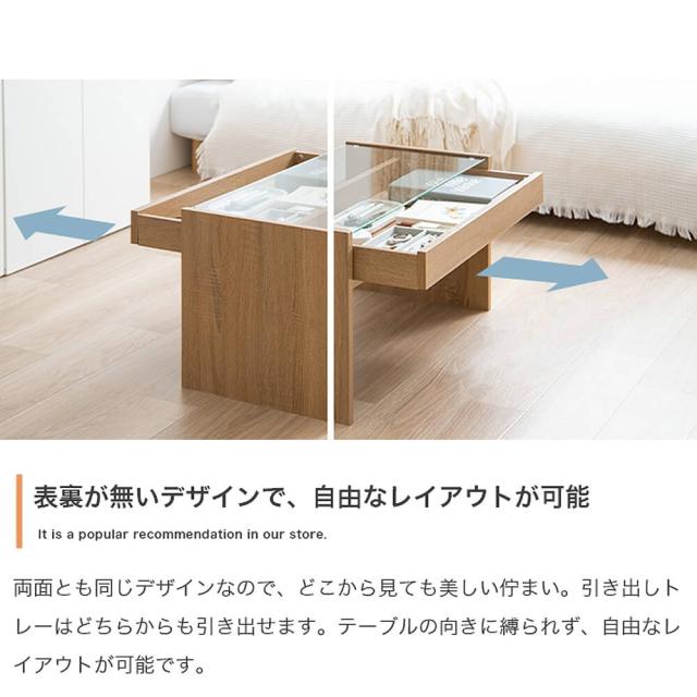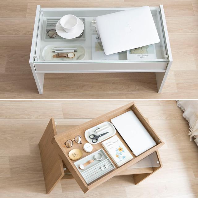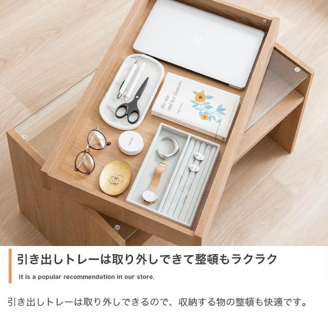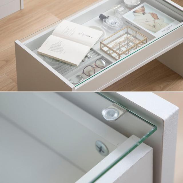 ガラス天板の下には引き出しトレーが付いており、お気に入りのアクセサリーや雑貨などを収納できます。
