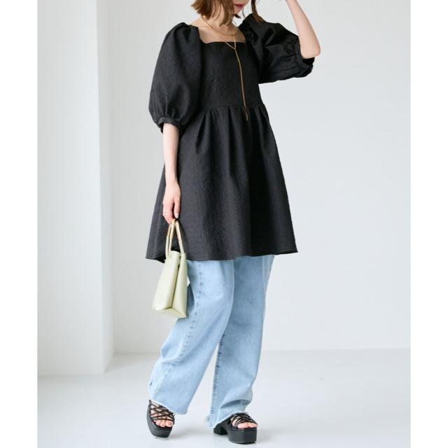 オフショルとしても使える広く開いたスクエアネックですっきりヘルシーな肌見せに。