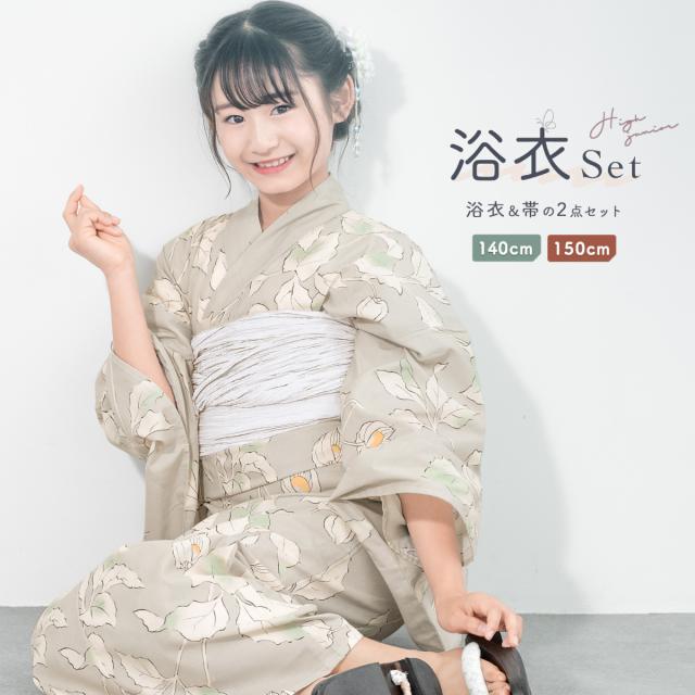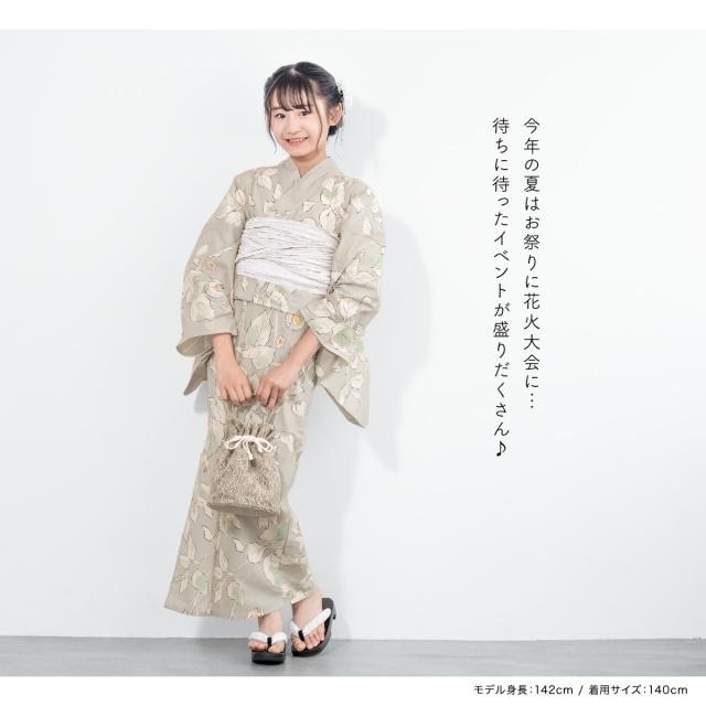 浴衣 子供 女の子 ジュニア セット 2点セット キッズ 女児 グレージュ 鬼灯 白茶 綿 夏 140cm 150cm 送料無料