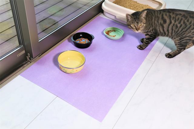 【ペットの食事場所の汚れ防止マット】(シリカゲル活性炭抗菌剤入り・ズレない滑り止め加工品)水のみ場、食事台等の下に敷いて飛び散り汚れ防止にも使用できます。床の保護にも大変便利なシート【使用方法】●紫の面を上に敷いてください(自由にカットできます)●水飲み場・食事の場所に敷いて下さい●トイレの周りに敷いても脱臭効果があります。●ケージ、サークルの中外にも敷いて使用できます●汚れ洗いは、ぬる湯に2時間漬け置きして洗浄、天日で乾燥してください。【材質】防ダニ剤セグロセラ、シリカゲル・活性炭・炭、PPスパンボンド(滑り止め加工)【使用期限】約6か月(使用条件により変わります)【ショップ:臭いナイ湿気ナイ HP:シーウエーブで検索】