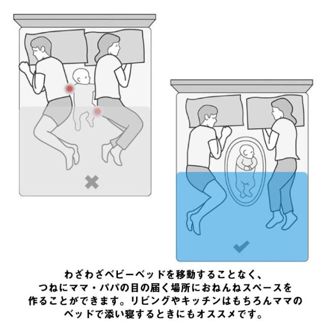 | 快適なスペースを作れるベッドインベッド 赤ちゃんがもっとも安心できる場所、お母さんの子宮をもとに設計。 狭すぎず、広すぎず、優しく包み込むような構造が心地よさの秘密。 わざわざベビーベッドを移動することなく、つねにママ・パパの目の届く場所におねんねスペースを作ることができます。リビングやキッチンはもちろんママのベッドで添い寝するときにもオススメです。 柔らかいコットン素材を使い、通気性抜群で赤ちゃんデリケートな肌を守ります。 全て丸洗いできて毎日清潔!各パーツも取り出し可能です。 | |