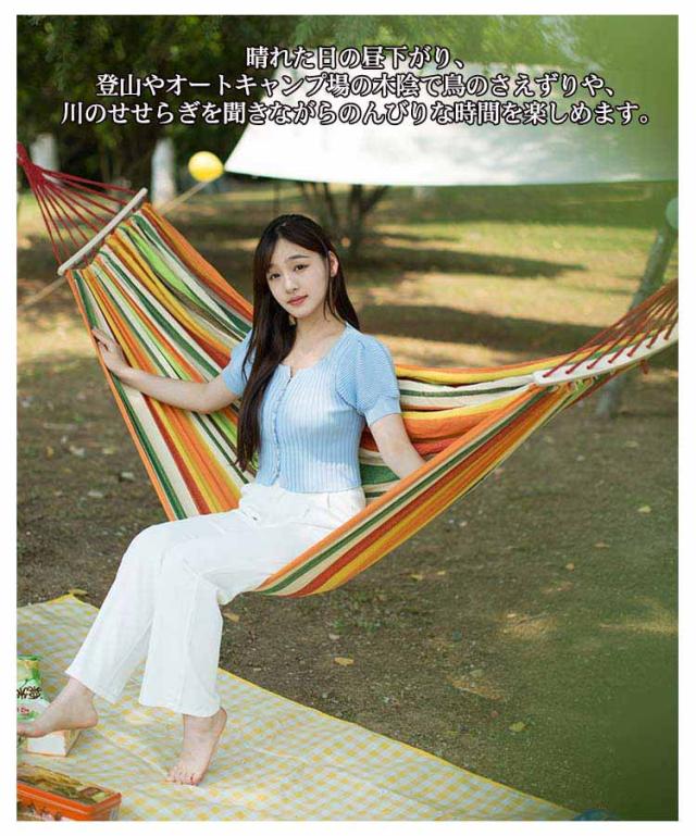 | 折りたたみやすく、持ち運びが簡単で、軽くて支えやすい。 軽量コンパクト収納で携帯に大変便利! スペースをほとんど必要とせず、コンパクトで持ち運びに便利な、収納袋が付き。 ハンモックは屋内または屋外での使用に十分な用途があり、季節に応じて移動するのに非常に軽いです。 折りたたみやすく、持ち運びが簡単で、軽くて支えやすい。 晴れた日の昼下がり、登山やオートキャンプ場の木陰で鳥のさえずりや、川のせせらぎを聞きながらのんびりな時間を楽しめます。 収納バック付き。 | |