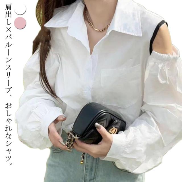 ボリューム袖 シャツ レディース 長袖 シャツブラウス バルーン袖 パフスリーブ 肩見せ 肩出しトップス オフショルダー ゆったり きれいめ 上品 おしゃれ 大人 おしゃれ 春 夏 秋 S M L XL