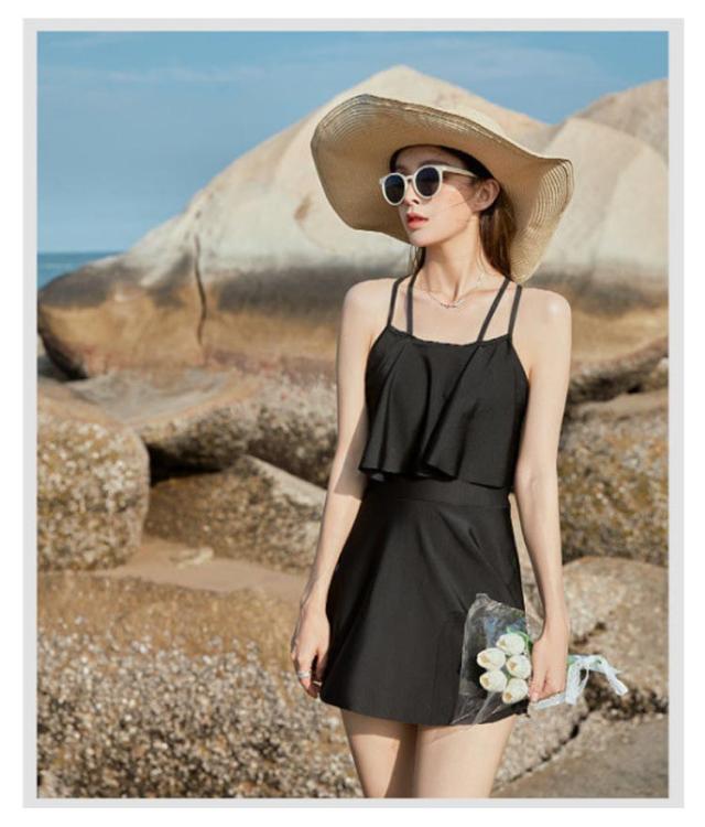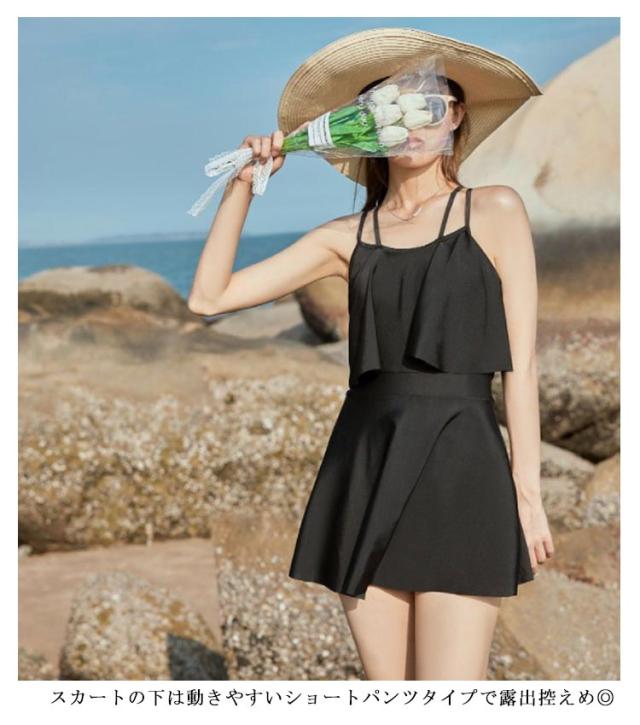 送料無料 水着 ワンピース レディース オールインワン体型カバー水着 ママ水着 20代 30代 40代 オトナ女子 フリル フレアスカート 可愛い お洒落 エレガント 大人 女性 セクシー お腹 お尻 太もも カバーアップ 黒 露出控えめ