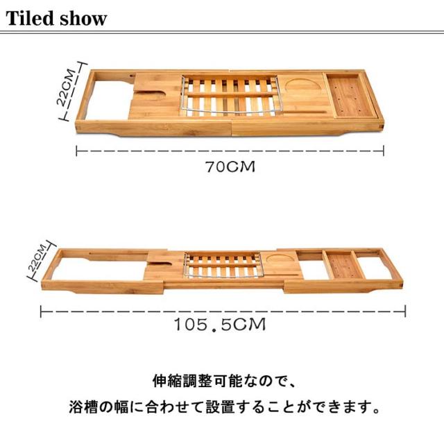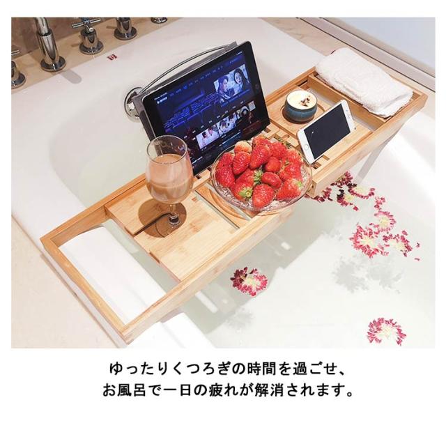 | ご自宅のお風呂に丁度いい!シンプル&機能的なバスタブトレーです。 伸縮調整可能なので、浴槽の幅に合わせて設置することができます。 入浴時に、スマホ、Ipad、本、ワイングラス、タオル、化粧水などが置く場を提供します。 耐久性高い天然の竹素材を使用して作られた、清潔感と上品さが備わっています。 ゆったりくつろぎの時間を過ごせ、お風呂で一日の疲れが解消されます。 | |