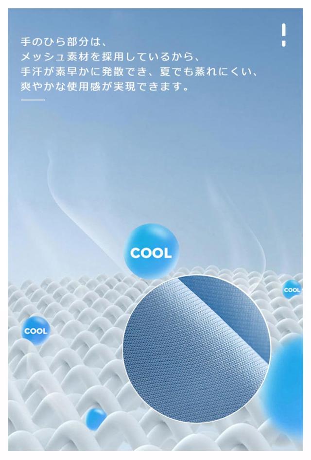 | 冷感素材により涼しく日焼け対策が可能のグローブ 優れた伸縮性&高弾力、柔らかく快適で、手にフィットし、ソフトな肌触りがあります。 吸水・速乾性でさらっとした着日焼け止めよりも手軽にお肌への負担も少なく紫外線ケアができるのも嬉しいポイントです。 右手の人差し指&親指の先端が指出しタイプなので、手袋をつけたままでスマホやタブレットなどに操作できます。心地 手のひら部分は、メッシュ素材を採用しているから、手汗が素早かに発散でき、夏でも蒸れにくい、爽やかな使用感が実現できます。 アウトドア(キャンプ フェス BBQ)や旅行の際にも軽量で持ち運びに便利です。 | |