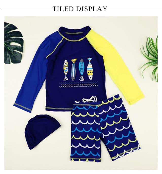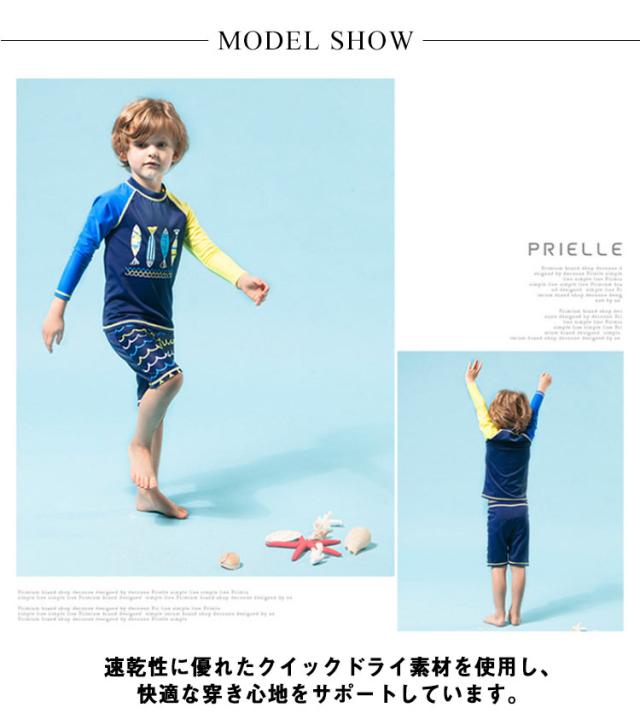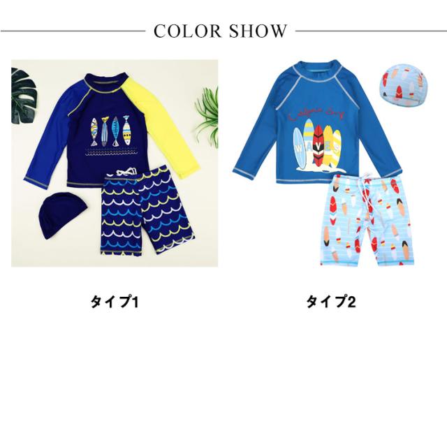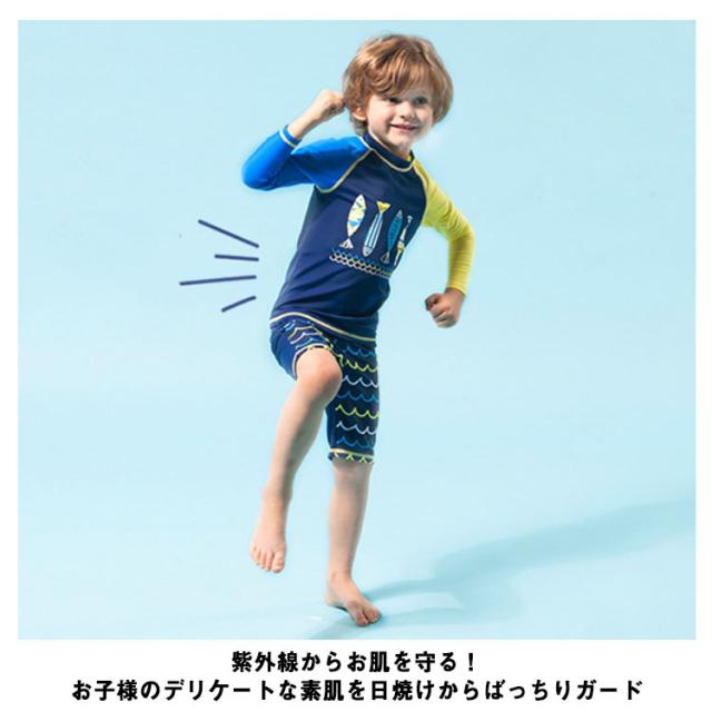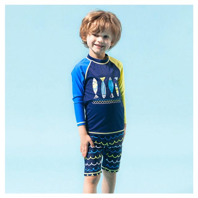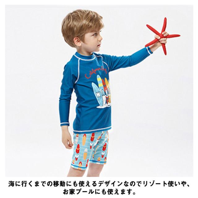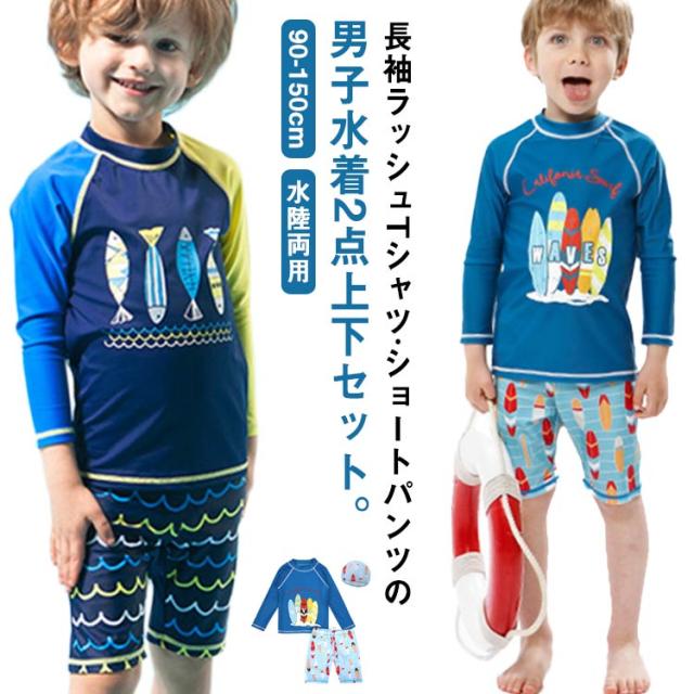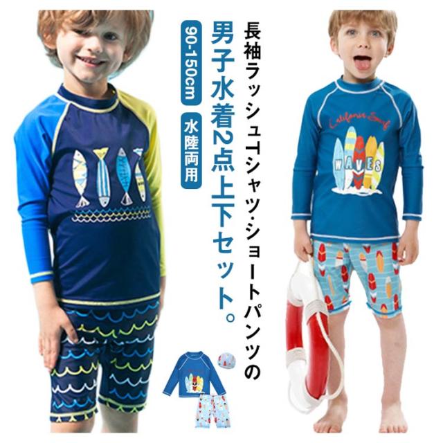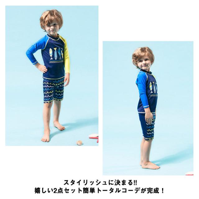 キッズ 水着 セパレート 上下2点セット 長袖 ラッシュTシャツ ショートパンツ 子ども 男の子 ラッシュガード 水着 水陸両用 魚柄 90 100 110 120 130 140 150 cm 小学生 ジュニア 男児 速乾 吸水 ストレッチ プール 海 川 リゾート 水遊び