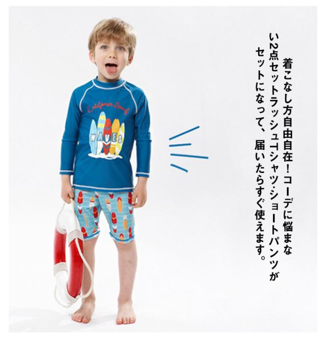 | 長袖ラッシュTシャツ?ショートパンツの男子水着2点上下セット。【90-150cm】【水陸両用】 着こなし方自由自在!コーデに悩まない2点セットラッシュTシャツ?ショートパンツがセットになって、届いたらすぐ使えます。 速乾性に優れたクイックドライ素材を使用し、快適な穿き心地をサポートしています。 ストレッチの利いた生地は海やプールなどのアクティブなシーンでも動きやすさをしっかりアシスト。 紫外線からお肌を守る!お子様のデリケートな素肌を日焼けからばっちりガード スタイリッシュに決まる!!嬉しい2点セット簡単トータルコーデが完成! 海に行くまでの移動にも使えるデザインなのでリゾート使いや、お家プールにも使えます。 | |