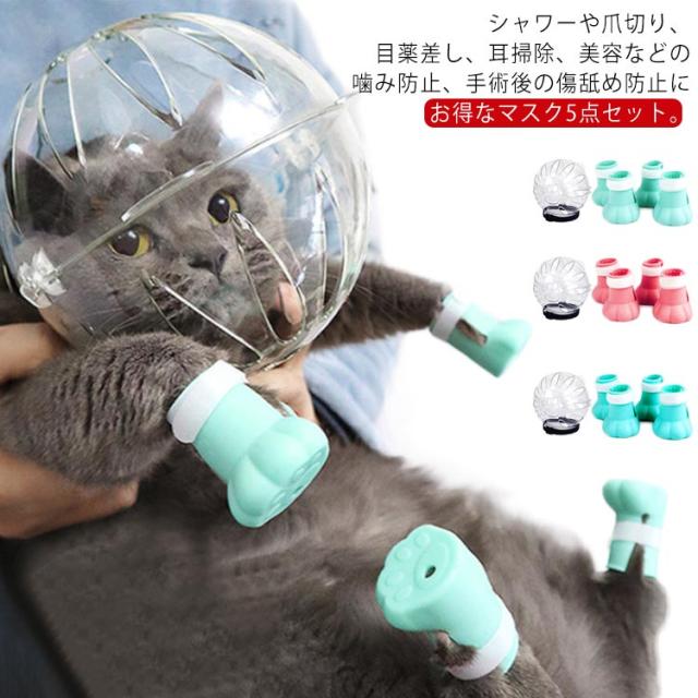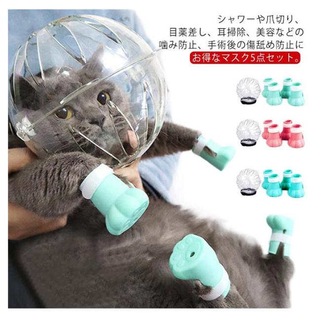 新作! 5点セット 猫用マスク 口輪 フートカバー付き 明 ペットマスク 宇宙ヘッドギア 口輪 通気 ネコ ねこ 爪切り補助具 耳掃除 シャワー 美容 噛みつき防止 ペットエリザベスカラー キャットマズル ペット用品