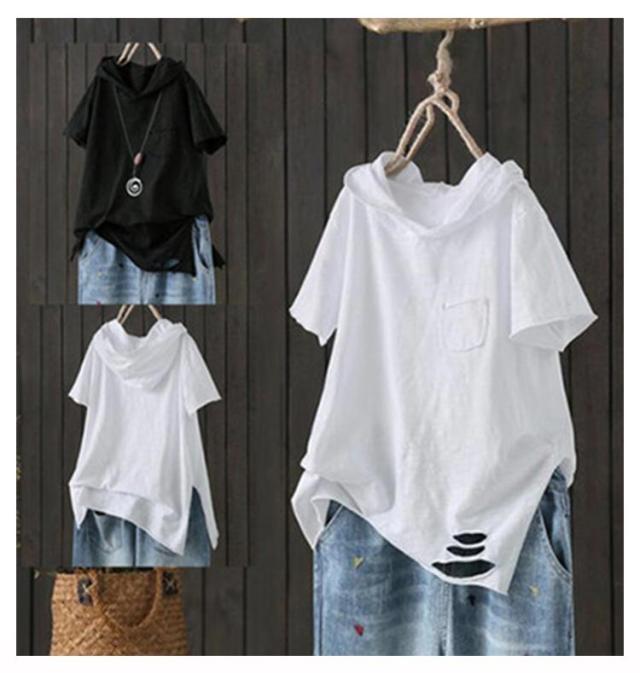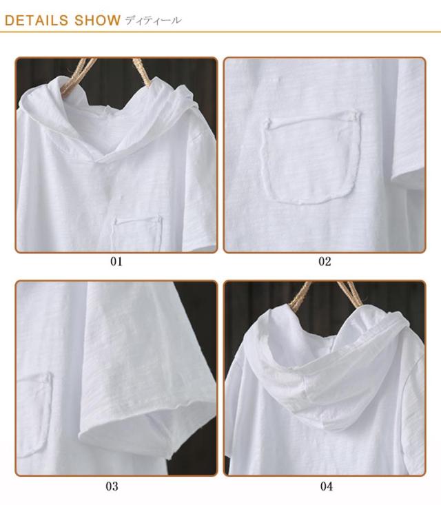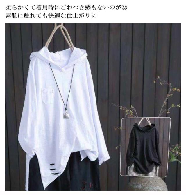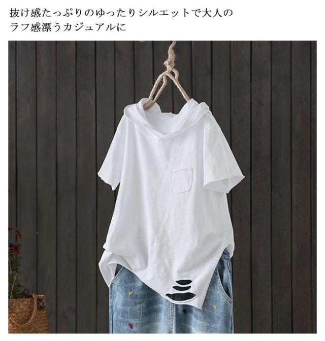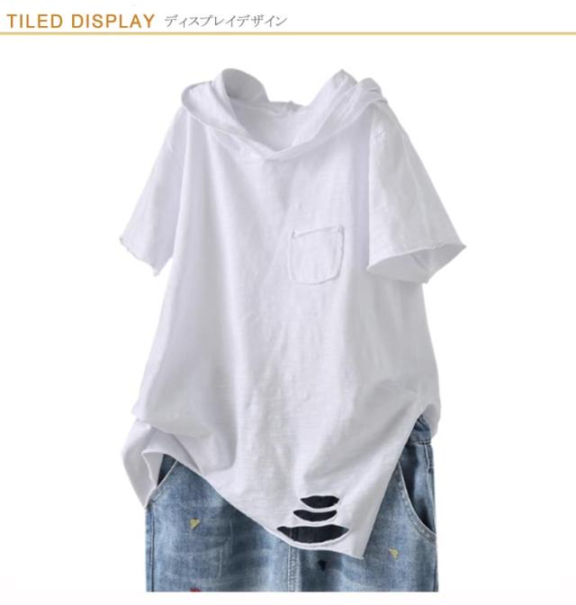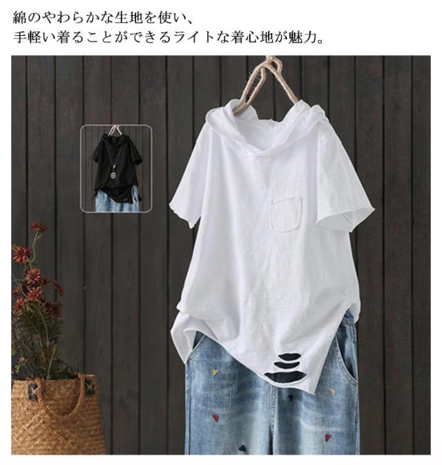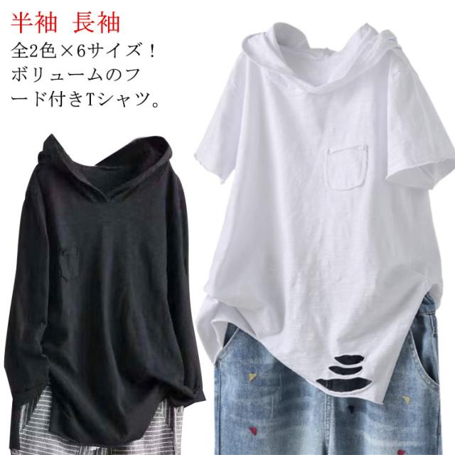 フード付きtシャツ レディース 送料無料 ダメージ ロングtシャツ 夏用パーカー tシャツ トップス フード付き 半袖tシャツ フード付き プルオーバー カットソー 綿 春服 夏服 半袖 長袖 シンプル おしゃれ ホワイト ブラック