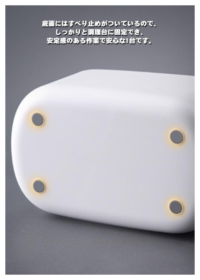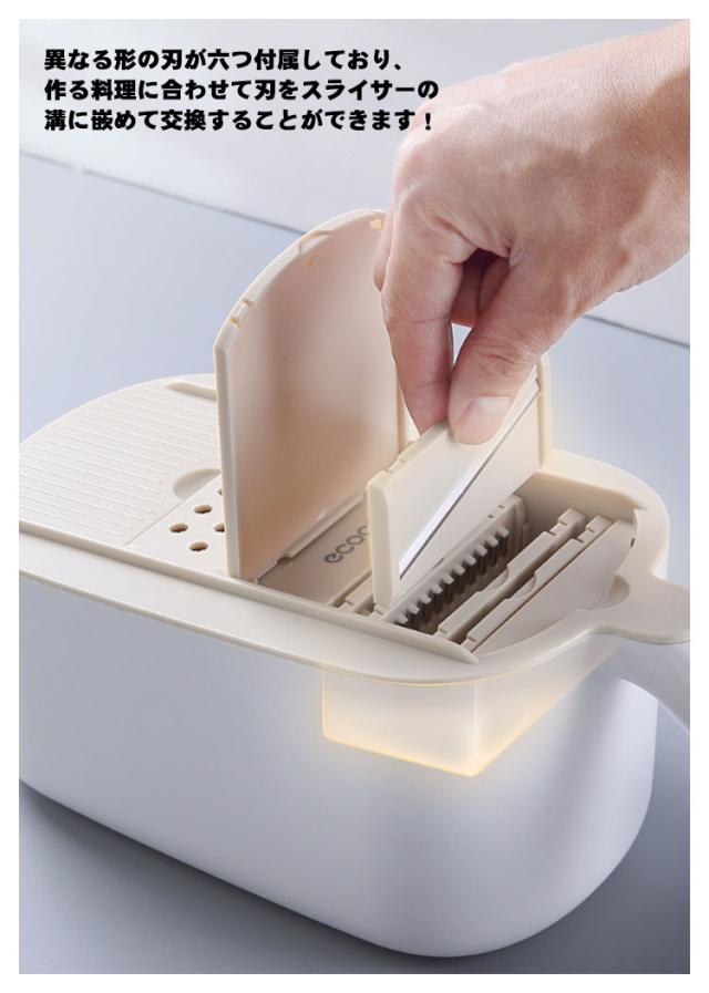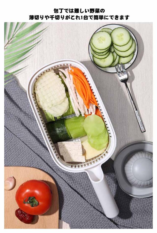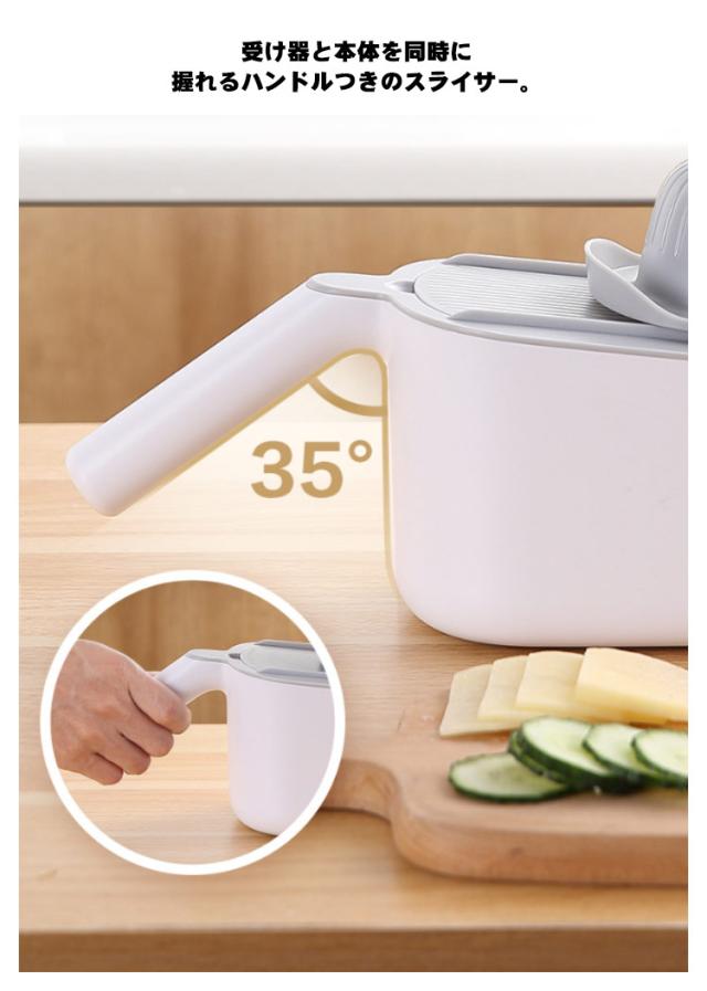 | 1台7役!取り替えもかんたんな多機能スライサー 【使い勝手がいい「野菜調理器セット」】 こちらの「多機能スライサー」は千切りやみじん切り、細切りなど、 さまざまな用途にいかせます。異なる形の刃が六つ付属しており、 作る料理に合わせて刃をスライサーの溝に嵌めて交換することができます。 【収納しやすいコンパクトサイズが魅力】 おろし器、薄切り、厚切り、細切り、太切り、花型切りの6枚のプレート と刃先から指を守ってくれるガードホルタとボウル・ザルがセットになった商品です。 コンパクトサイズなので一人暮らしのお部屋にも収納しやすくておすすめです。 包丁では難しい野菜の薄切りや千切りがこれ1台で簡単にできます。 【しっかり握れるハンドルつき! 安定感も抜群】 受け器と本体を同時に握れるハンドルつきのスライサー。 底面にはすべり止めがついているので、しっかりと調理台に固定でき、 安定感のある作業で安心な1台です。 【安全に使える機能を備えたスライサー】 突起針付きガードホルダは、力加減を誤ったり指を滑らせたりしても指が刃に触れることなく安全です。 食材を挟んで固定できる 突起針は食材が短くなっても固定して使用できるため食材を最後まで無駄なく使える。 【分解できるため、洗いやすくて衛生的】 こちらのスライサーは分解できるため、とても簡単に洗うができ、 細かい部分までしっかり洗い流せるので便利で衛生的です。 | |
