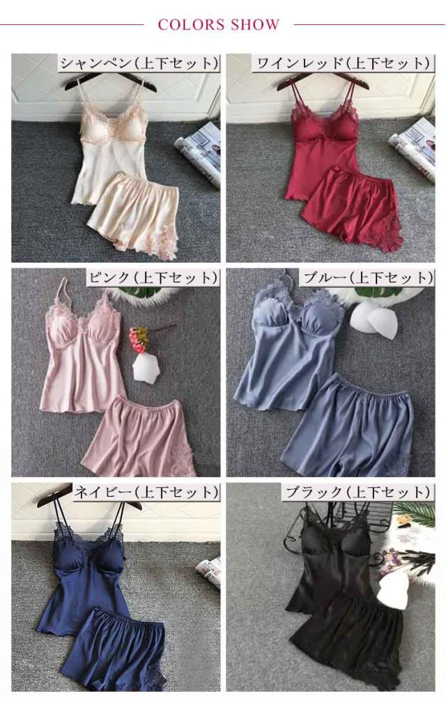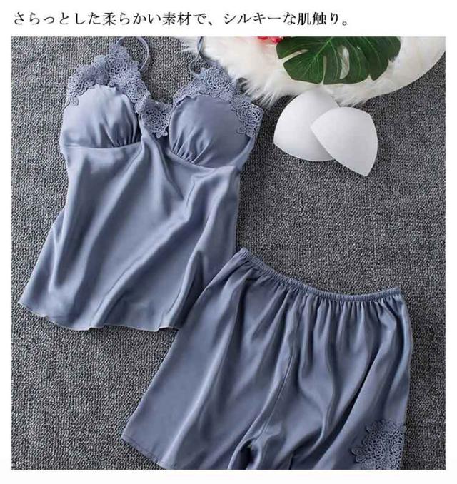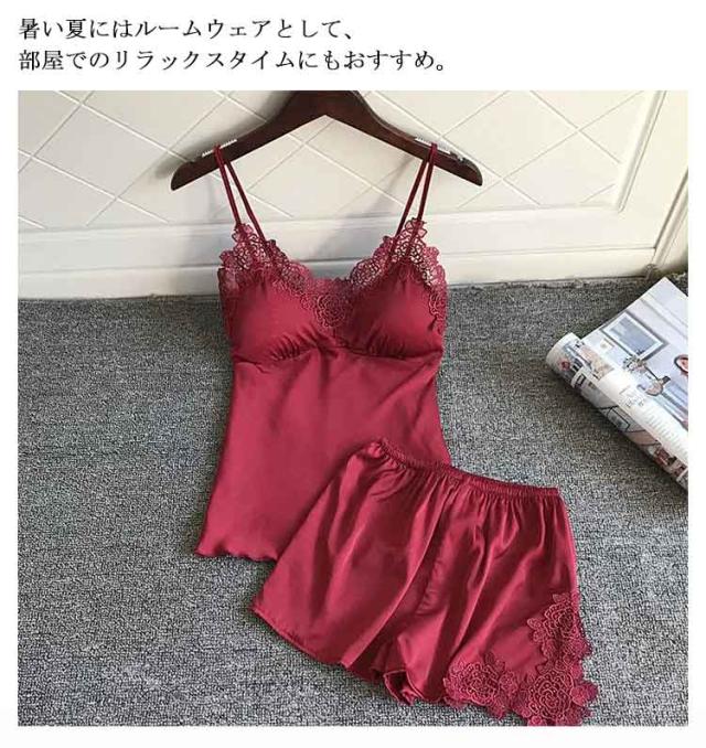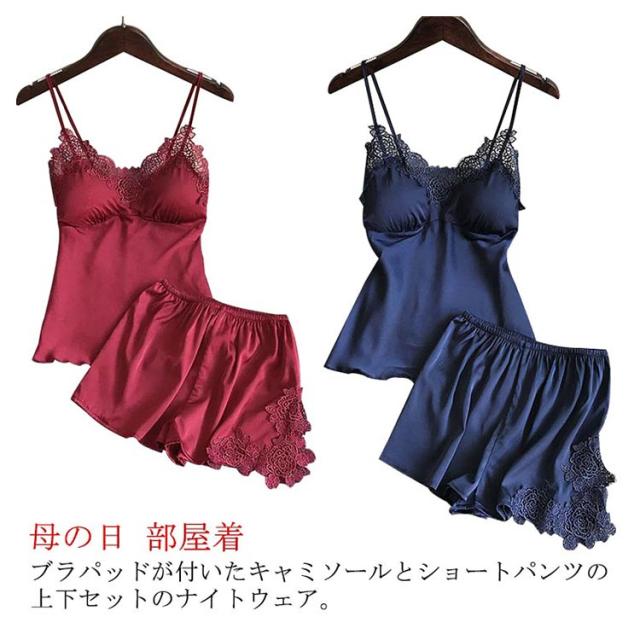ランジェリー ルームウェア 2点セット 上下セット レディース サテン パジャマ セット キャミソール レース ナイトウェア 刺繍 花柄 薄手 寝間着 可愛い 部屋着 夏 春 カップ付き 送料無料