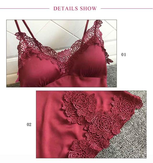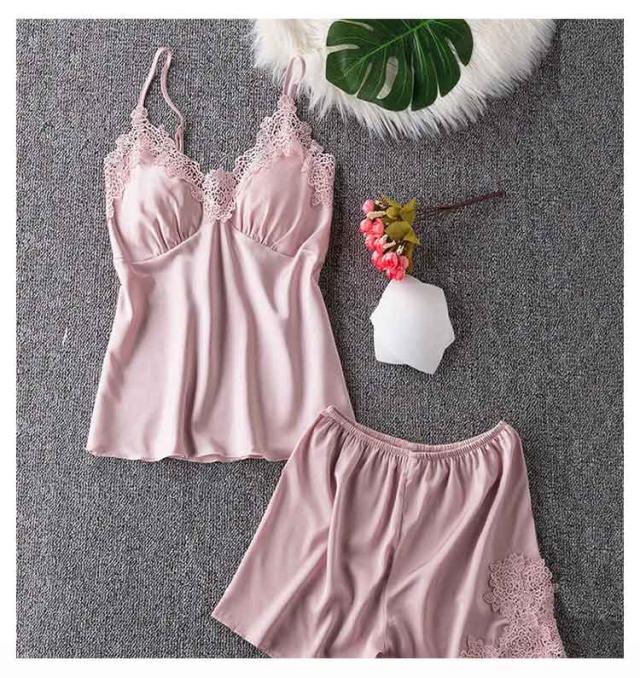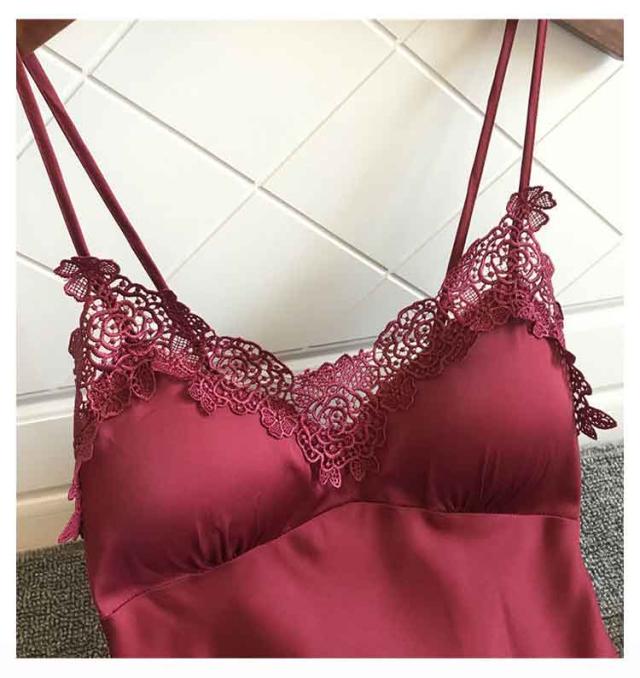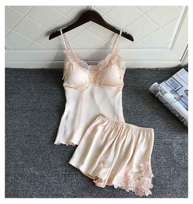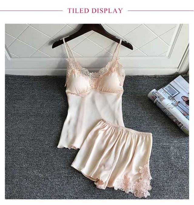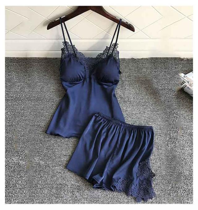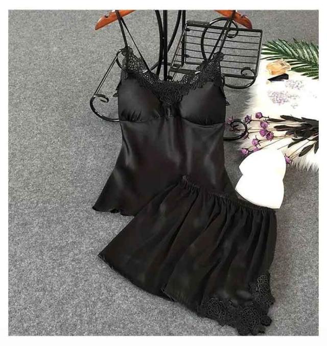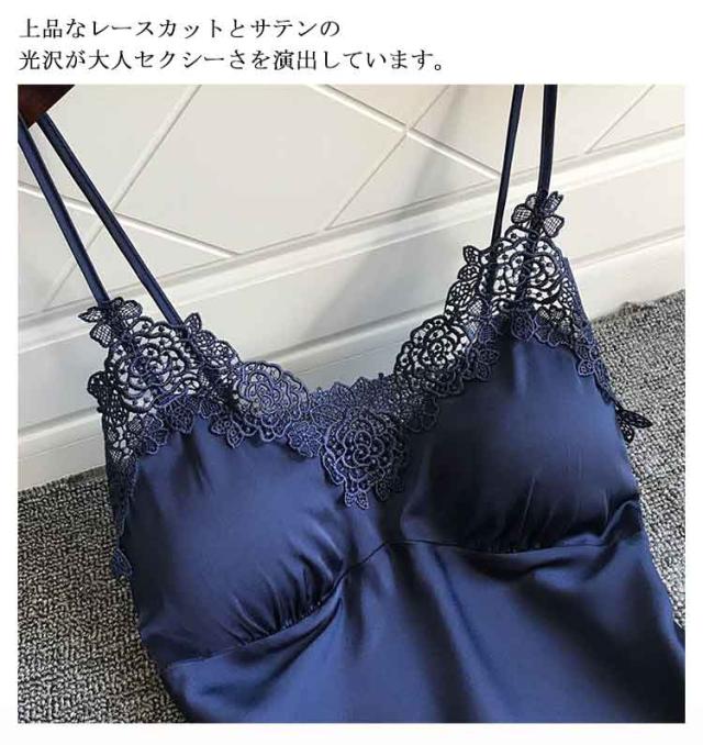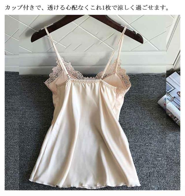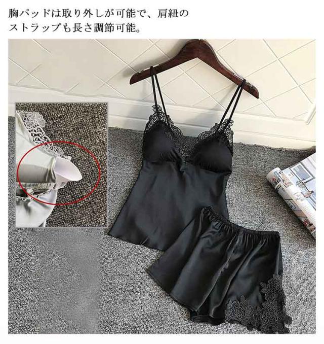 | ブラパッドが付いたキャミソールとショートパンツの上下セットのナイトウェア。 上品なレースカットとサテンの光沢が大人セクシーさを演出しています。 さらっとした柔らかい素材で、シルキーな肌触り。暑い夏にはルームウェアとして、部屋でのリラックスタイムにもおすすめ。 カップ付きで、透ける心配なくこれ1枚で涼しく過ごせます。胸パッドは取り外しが可能で、肩紐のストラップも長さ調節可能。 | |