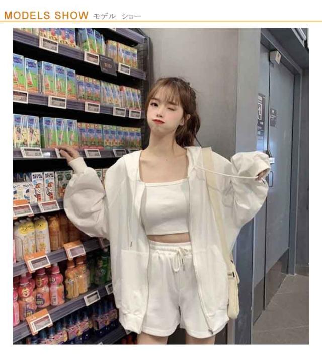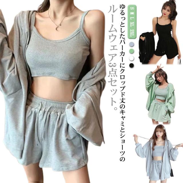 ルームウェア レディース セットアップ 上下セット パーカー カーディガン タンクトップ キャミソール ショーツ ハーフパンツ パジャマ 部屋着 ワンマイルウェア クロップド丈 スウェット ポケット付き 可愛い お洒落 シンプル 無地巻 リラックスウェア