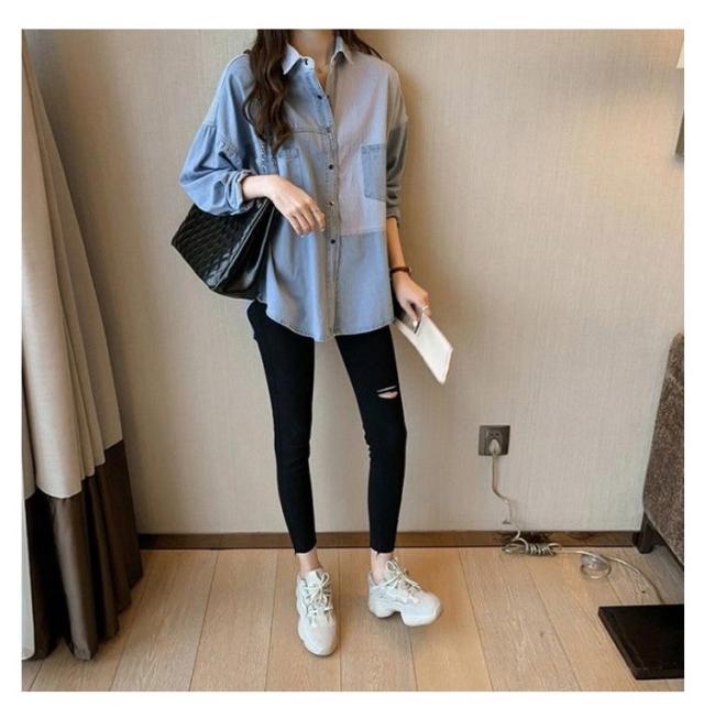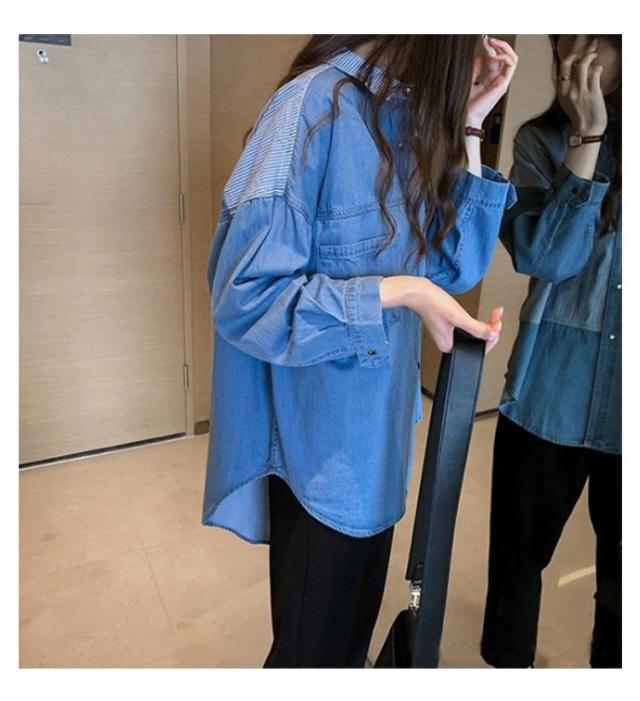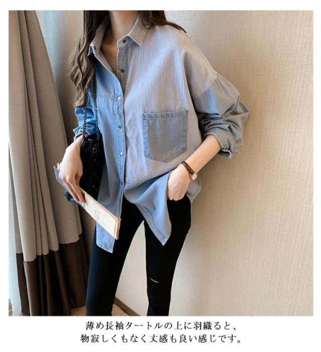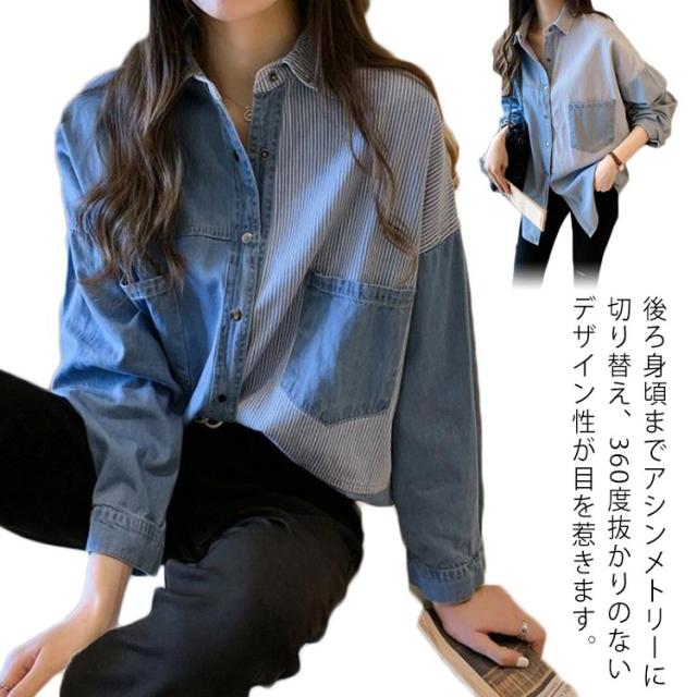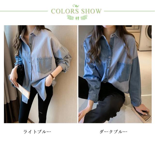 送料無料 パッチワークシャツ デニムシャツ ダンガリーシャツ 定番 羽織 レディース 切り替え 長袖シャツ トップス 長袖 ロング丈 羽織り デニムジャケット 春アウター ゆるシャツ オーバーサイズ ヴィンテージ