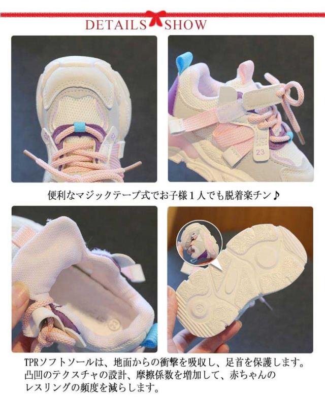 | 赤ちゃんのために設計したスニーカー。 ボックスデザインで足首を保護しかかとを固める。 快適で曲がって歩きやすく、足の裏の筋肉に負担をかけず、より健康的。 TPRソフトソールは、地面からの衝撃を吸収し、足首を保護します。 凸凹のテクスチャの設計、摩擦係数を増加して、赤ちゃんのレスリングの頻度を減らします。 幅の広い頭は厚くて衝突防止の包頭設計、快適で足を圧迫しません。 快適で肌に優しい通気性インソール内蔵で、湿気を吸い込み、足が臭くなりにくい。 足首をいたわるクッション性に優れています。 便利なマジックテープ式でお子様1人でも脱着楽チン♪ | |