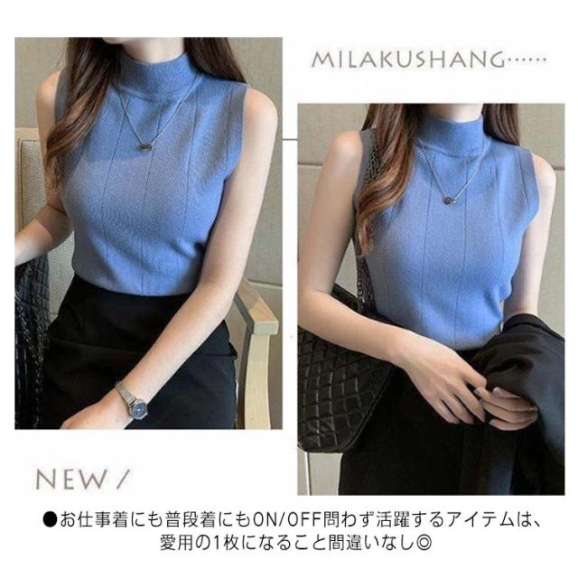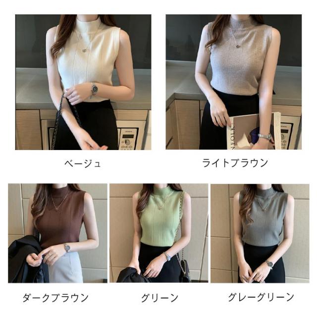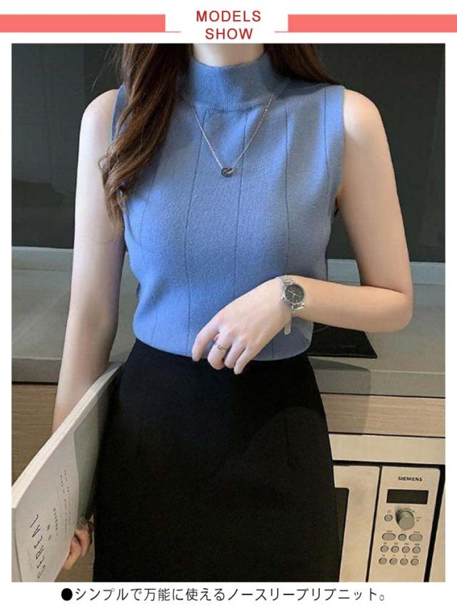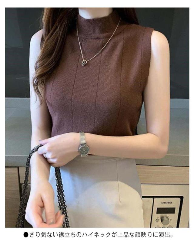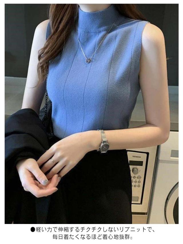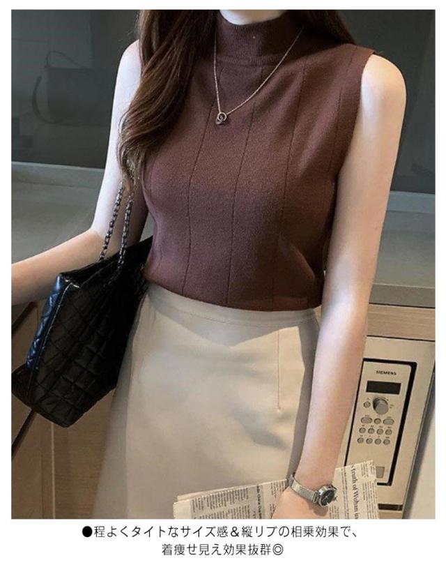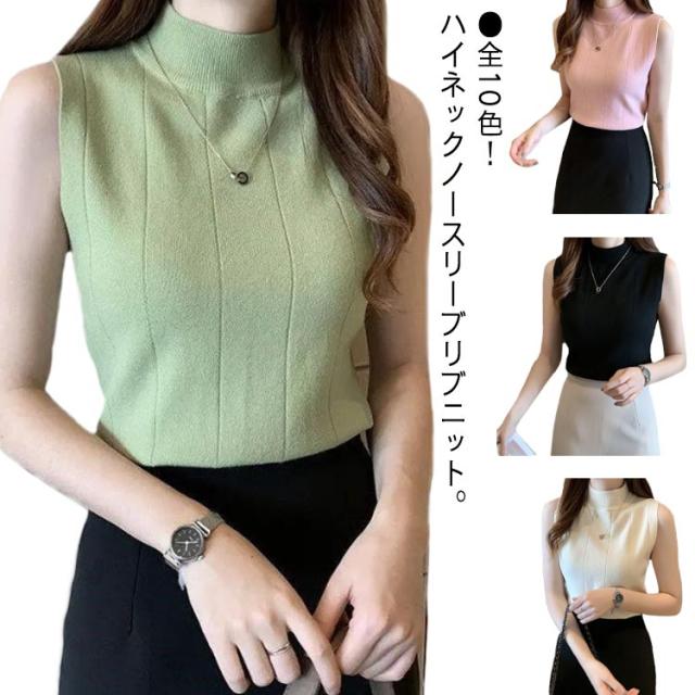 サマーニット ノースリーブ レディース トップス リブニット 袖なし 薄手 夏 送料無料 細見え モックネック ハイネック 無地 カットソー タンクトップ 重ね着 キャミソール リブ編み 仕事着 通勤 オフィス