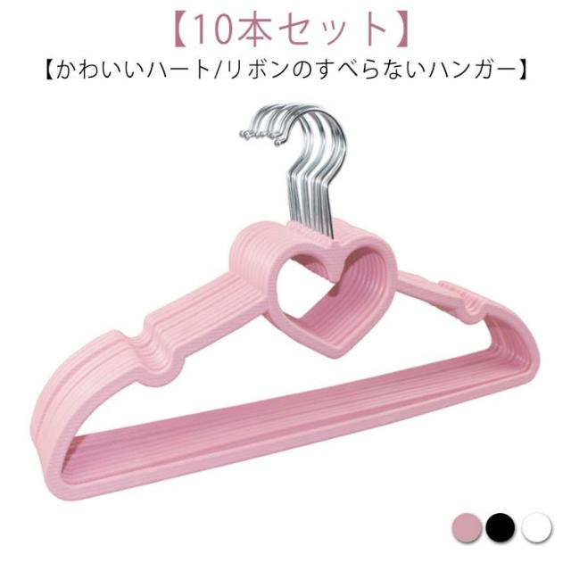 10本セット ハート ハンガー すべらない すべらないハンガー リボン オシャレ スカート ズボン 収納 ステンレス ラック コンパクト かわいいハートのすべらないハンガー 衣類をすっきり収納 10本セット 黒 白 ピンク ブラック ホワイト