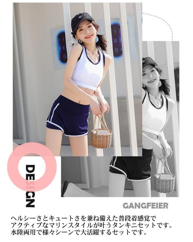 | カバーTシャツ&ショートパンツ&タンキニの水着3点セット 丈が長いのでお腹周りを隠してくれ、派手な露出がないので安心して着用できます。 ショートパンツもリラックスして着られ、ラフでカジュアルなビーチスタイルが完成します。 海やプール、アウトドアはもちろん、ジム等の運動やタウンユースでも大活躍します。 ヘルシーさとキュートさを兼ね備えた普段着感覚でアクティブなマリンスタイルが叶うタンキニセットです。水陸両用で様々シーンで大活躍するセットです。 | |