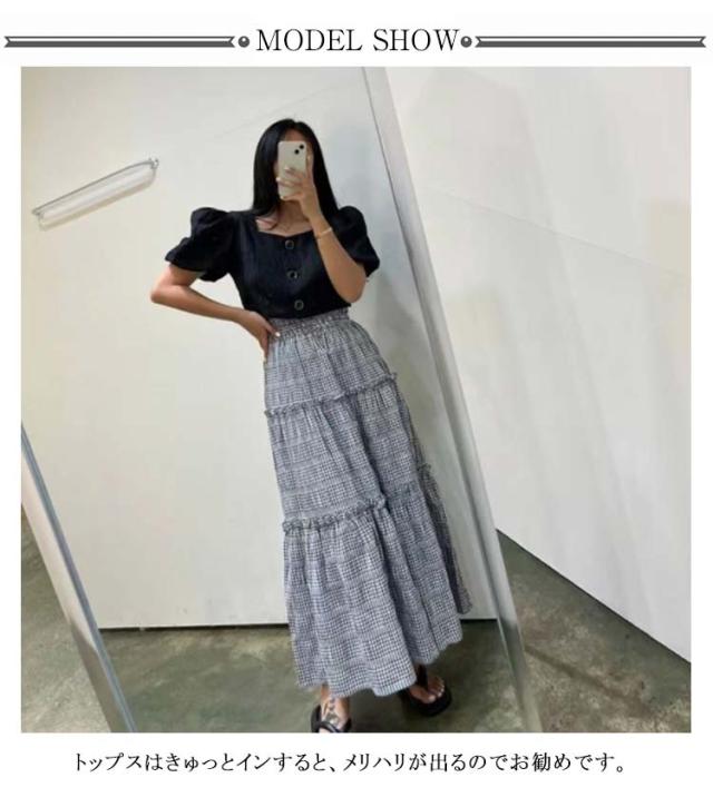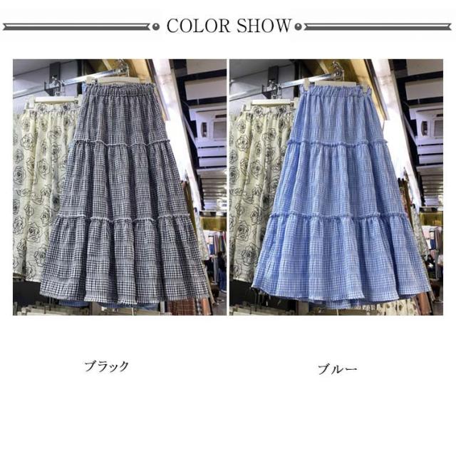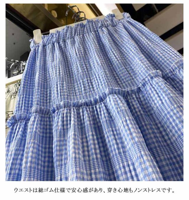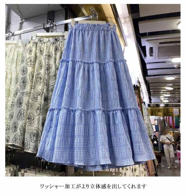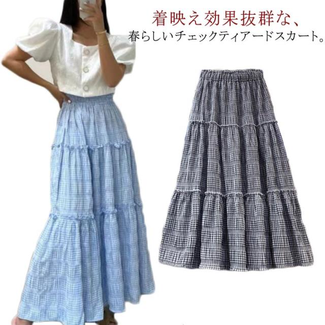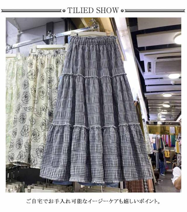 スカート チェック柄 ティアードスカート ロング丈 Aライン ウェストゴム ボトムス ワッシャー加工 マキシスカート 大人 きれいめ デイリー フリーサイズ 春 夏 全2色
