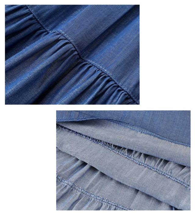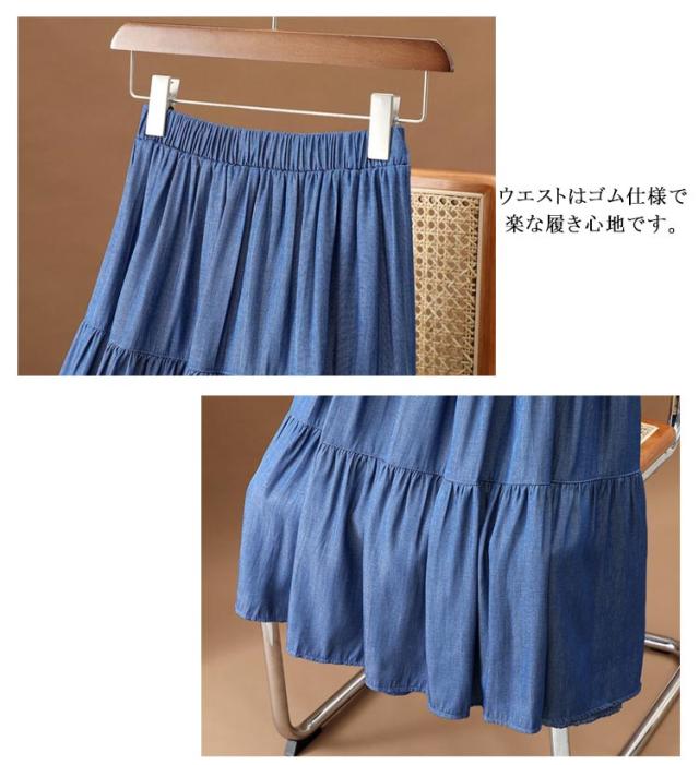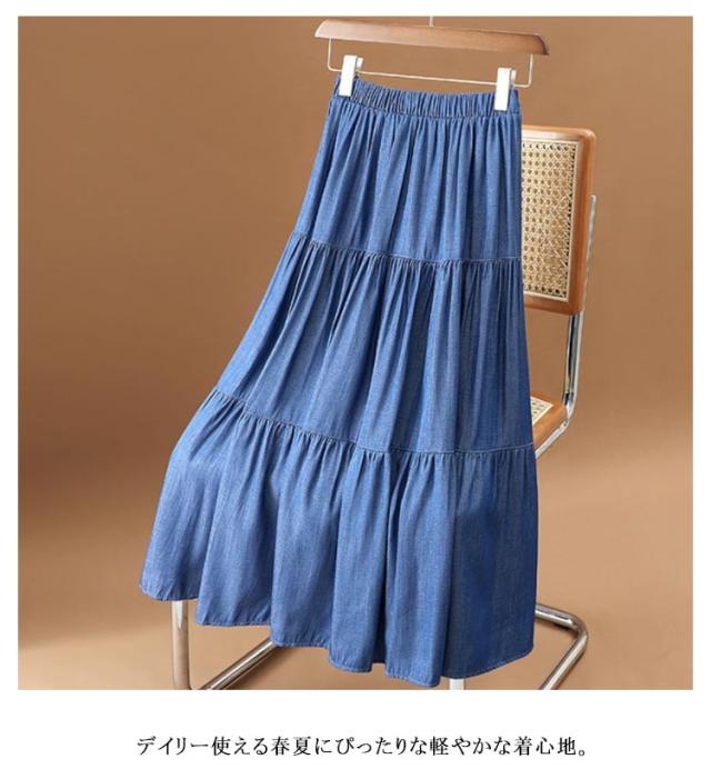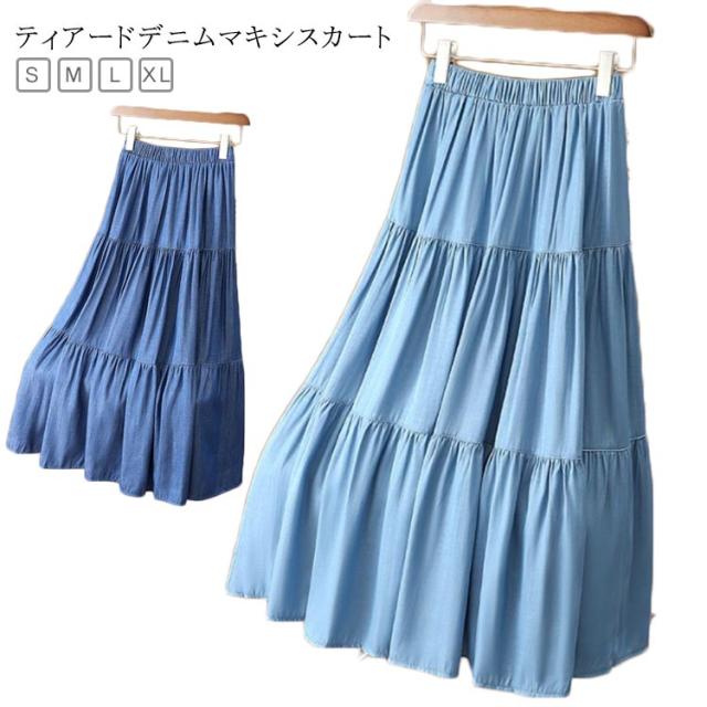 デニムスカート ティアードスカート ギャザー レディース Aライン ウェストゴム ボトムス ロング 大人カジュアル 大人可愛い 夏 無地 全2色