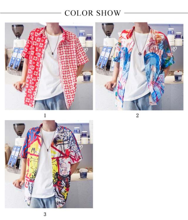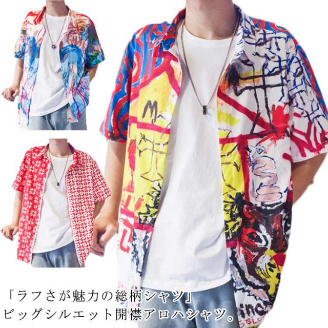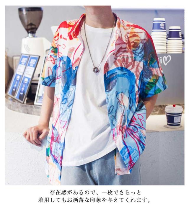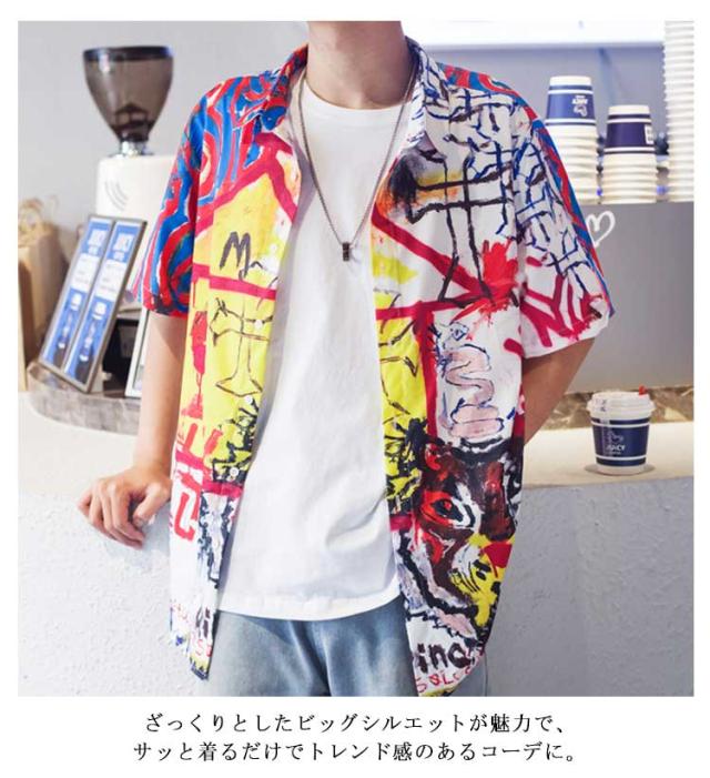 総柄シャツ 半袖 メンズ 半袖シャツ マルチ柄 総柄 開襟シャツ アロハシャツ 開襟 オープンカラー 明るい カラフル 落書き プリント おしゃれ オーバーサイズ 羽織り ストリート ビーチ リゾート 海辺 大きいサイズ S M L XL 2XL 3XL