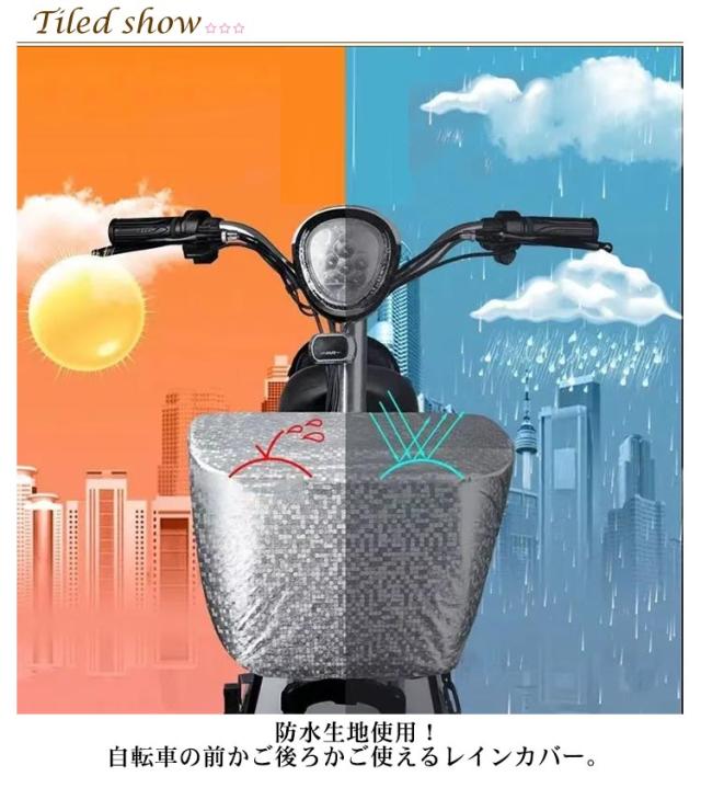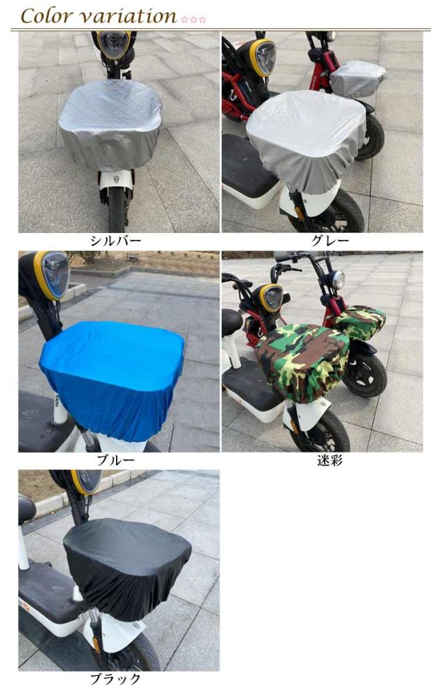 | 自転車のカゴにガバっとかぶせて雨よけ! 防水生地使用!自転車の前かご後ろかご使えるレインカバー。 サッと取り出し、ガバっと被せるだけ。大切な荷物を守ります! しっかりした生地を使って長くお使いいただけます。 豊かなカラーバリエーション、自転車に合わせやすい。 | |