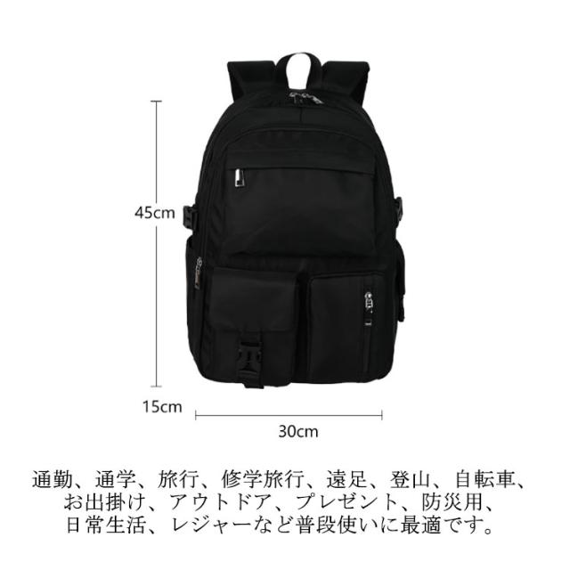 | 【高品質素材&撥水・防汚加工】耐摩耗性が高く、引き裂きや水に強く長持ちできます。 【軽量で大容量】収納力は十分にあり、A4サイズの雑誌・教科書、ノートPC、傘、衣類、飲み物、お弁当等が入ります。通学や通勤や旅行や出張などにおすすめです。耐衝撃仕様でクッション付きのPC専用ポケットは、15.6インチまでのパソコンが収納可能です。ペン、ノート、財布、携帯などの小物を分類して収納するポケットがあり、収納に心配はありません。外部にメインポケット×2、フロントポケット×3、サイドポケット×2、背面独立ポケット×1/内部にファスナーポケット×1、オープンポケット×5、パソコン専用スペース。容量約25L。 【様々な用途】メンズ、レディース、年齢を問わず使用できるシンプルなデザインと機能性が揃ったリュックです。通勤、通学、旅行、修学旅行、遠足、登山、自転車、お出掛け、アウトドア、プレゼント、防災用、日常生活、レジャーなど普段使いに最適です。軽い1-2泊出張にも使えます。毎日持ち歩くバッグに最適です。 【細部に拘ったデザイン】ファスナーを採用し、しっかりとした縫製を加え、品質にこだわった製品に仕上げました。使用時の破損防止のために、ショルダーの付け根のように圧力を受けやすい箇所は補強されています。S形の肩ヒモを採用。肩と背中の負担を効果的に分散させ、背負う時の圧力を軽減し、肩ずれも防止できます。通気性に優れたメッシュ生地を採用しており、快適に使用することができます。 | |