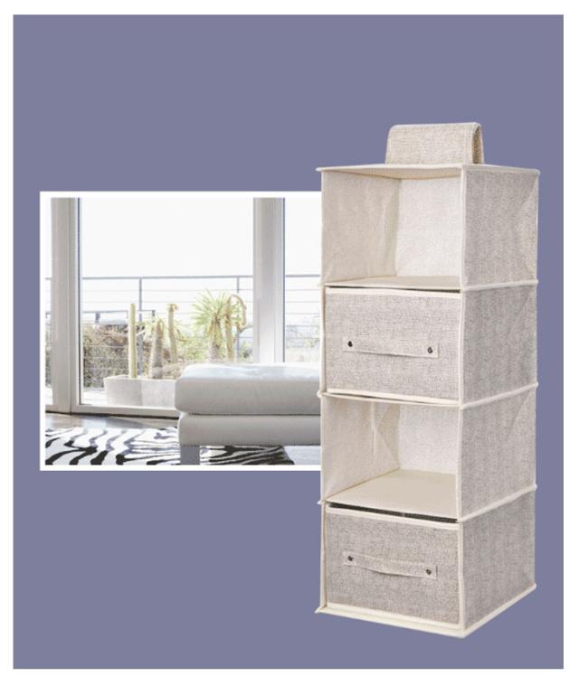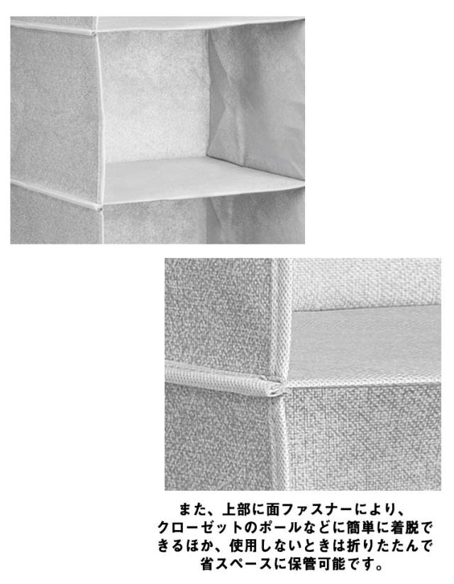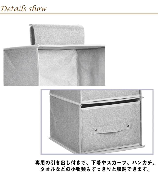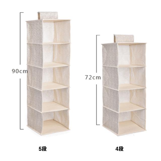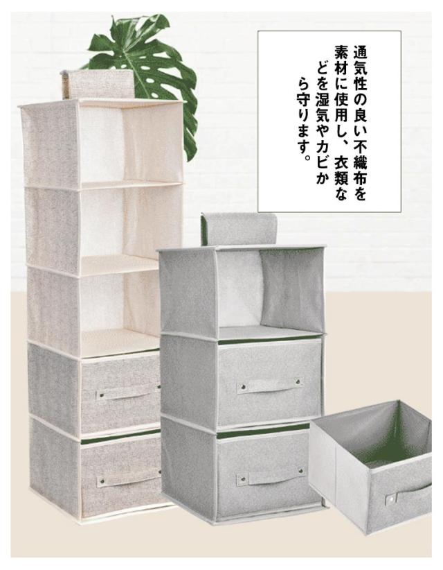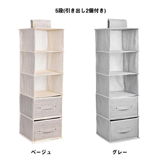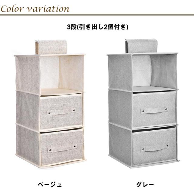 | 選べる3段式・4段式・5段式!引き出し2個付きの吊り下げ収納ラックです。 通気性の良い不織布を素材に使用し、衣類などを湿気やカビから守ります。 また、上部に面ファスナーにより、クローゼットのポールなどに簡単に着脱できるほか、使用しないときは折りたたんで省スペースに保管可能です。 専用の引き出し付きで、下着やスカーフ、ハンカチ、タオルなどの小物類もすっきりと収納できます。 | |