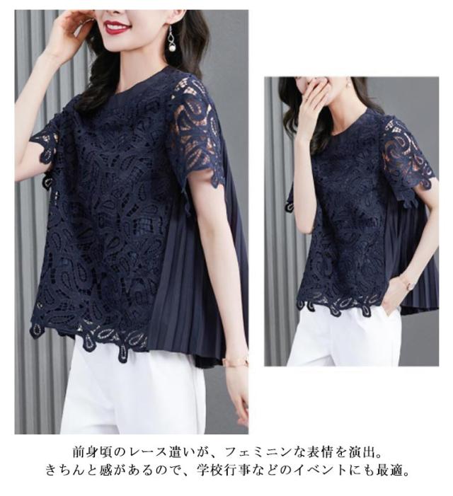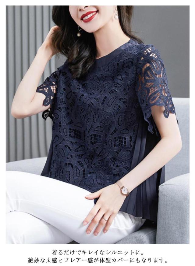 レースブラウス 半袖 春夏 総レース シースルー バックプリーツシャツ レディース トップス ブラウス スーツ インナー 花柄 丸襟 切り替え バックギャザー 通勤 OL 入学式 入園式 きれいめ 可愛い 春 夏 送料無料