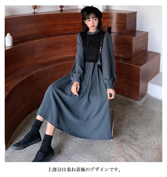 レイヤード風 ワンピース 長袖 フレアワンピース 送料無料 レディースワンピース 長袖ワンピース フリルネック ベスト風 くすみカラー Aライン ウエストマーク 着痩せ ミレモ丈 レディース 大きいサイズ デート レトロ 女子会 発表会 同窓会