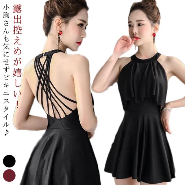 送料無料 ワンピース 水着 体型カバー レディース ハイネック ママ水着 フレア 小胸 バスト ミセス オトナ女子 無地 レース バッククロスデザイン フレアスカート スカート 黒 白 お腹 お尻 太もも 胸 カバーアップ 露出控えめ 大きいサイズ