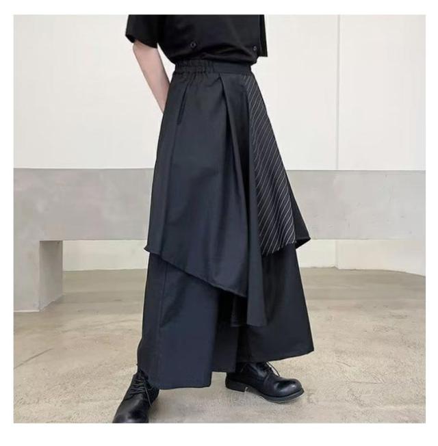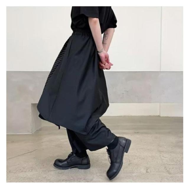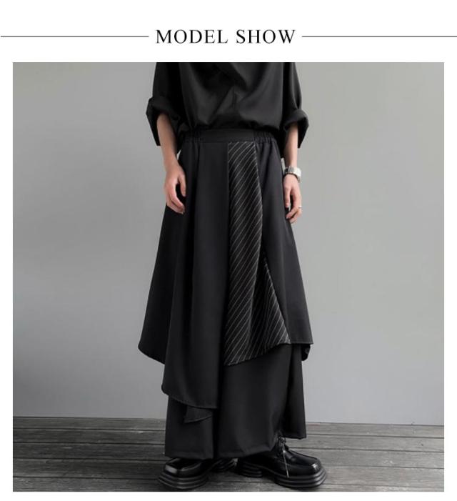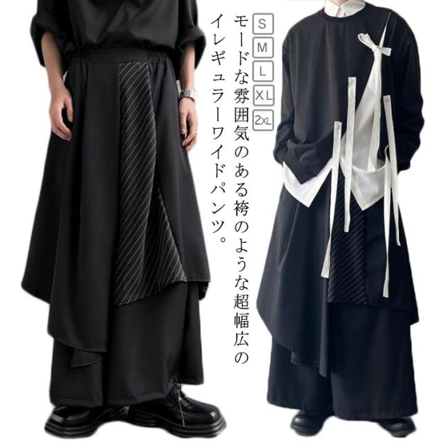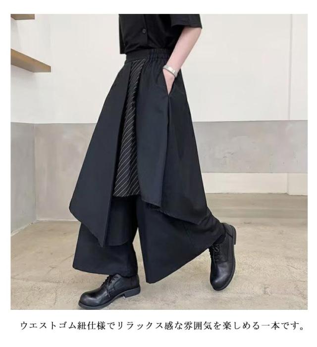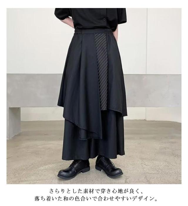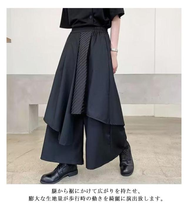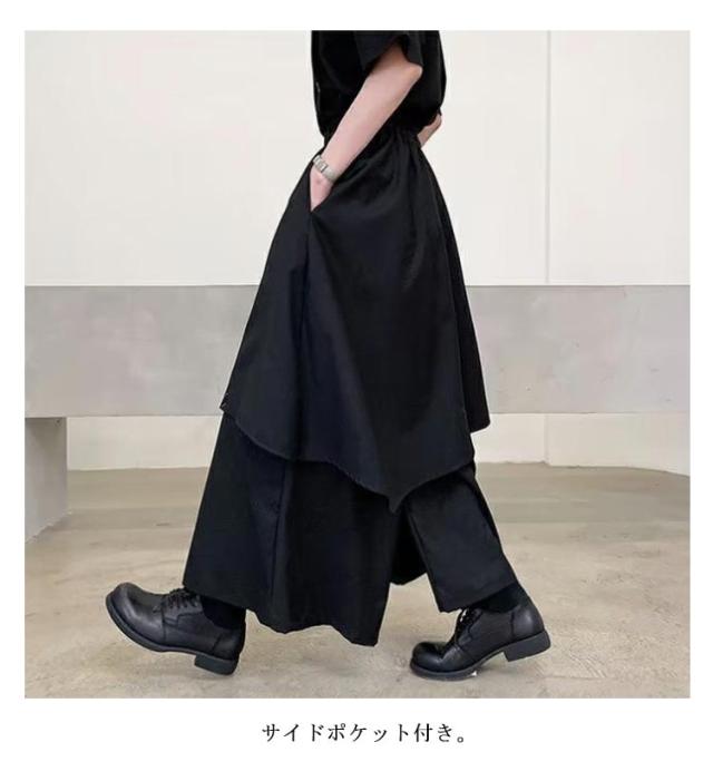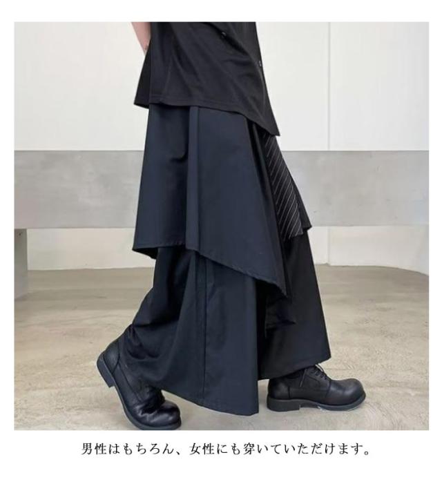 ワイドパンツ メンズ 袴パンツ ロング丈 イレギュラー フレアパンツ スカートパンツ スカート風 ガウチョ ゴムウエスト タック入り 薄手 春 夏 秋 ストリート モード系 v系 はかまパンツ 大きいサイズ レディース ユニセックス 黒 ブラック 【送料無料】