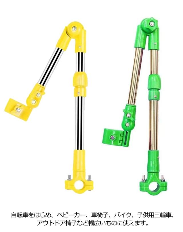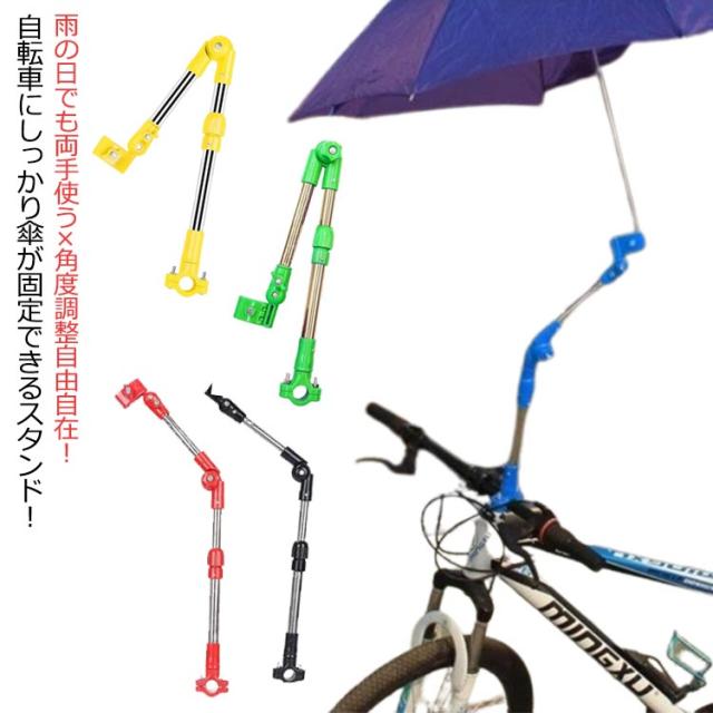| 自転車にしっかり傘が固定できるスタンド! 雨の日や日差しがきつい時、これさえあれば、雨や紫外線から守り、安全・安心して自転車が走行できます。 スタンド本体の長さは調節でき、乗る人の身長や自転車のハンドルの高さに合わせることができます。使用しない時は下に向けたりと、自由に角度も調節可能。 360度回転・180度角度調節できるので、雨の降り方や日光の向きによって角度調整できるから、使い勝手抜群。 取り付けは簡単!一度自転車やベビーカーに取り付けてしまえばあとは傘をクリップに挟むだけ! 梅雨シーズンや日差しが強い夏時、子供の送り迎えに大活躍に間違いなしの傘スタンド。 自転車をはじめ、ベビーカー、車椅子、バイク、子供用三輪車、アウトドア椅子など幅広いものに使えます。 | |