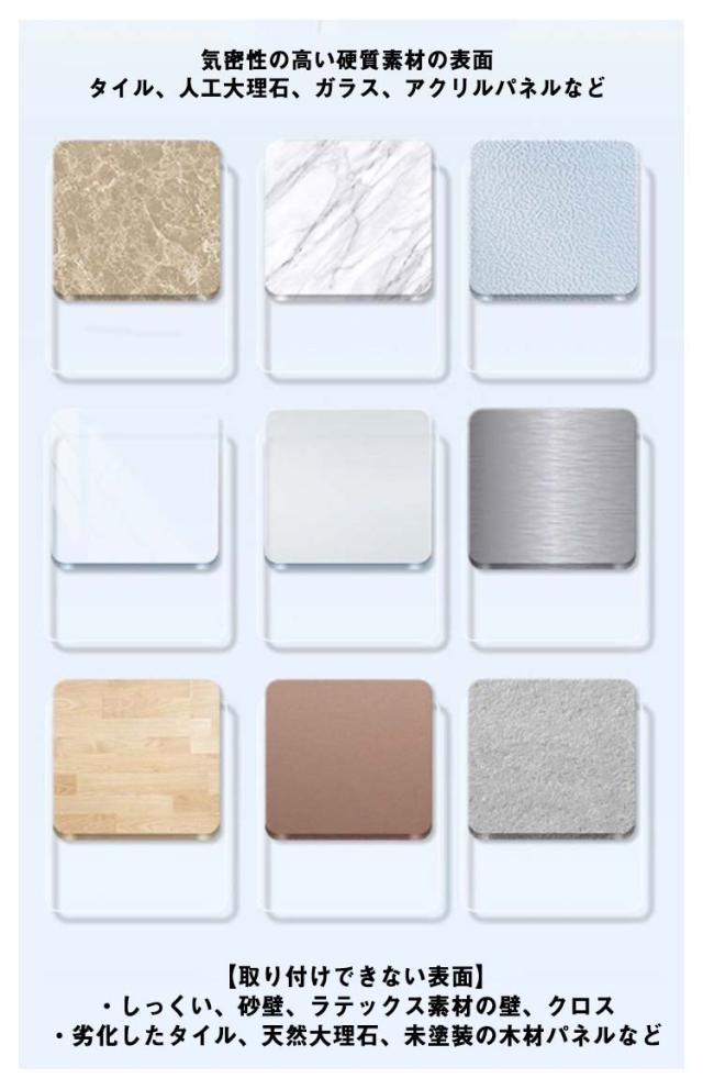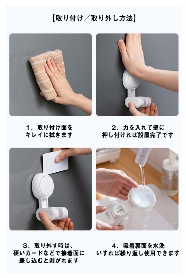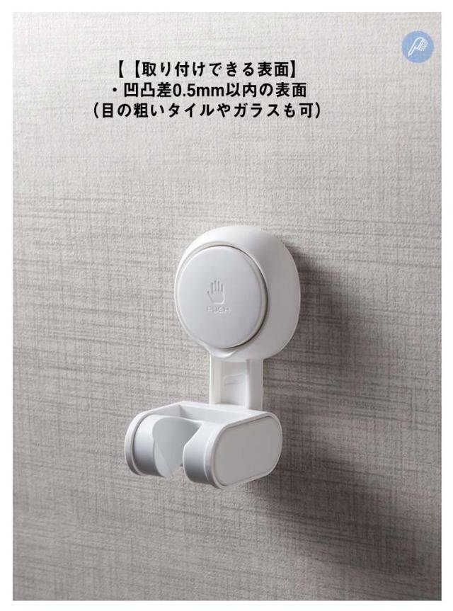 | 穴あけ不要! 角度調節可能!押すだけの簡単取り付けるシャワーフック 【カンタン取り付けですぐに使える】 ・ラクラク圧着、ポンッと取り付けすぐに使用可能 ・穴あけ工事や接着剤は不要 【設置や角度は自由自在】 ・取り付け位置は自由に調節 ・360度回転、上下は70度間で調整可能 【水に強く、長持ち】 ・防水防湿に優れたシャワーフック ・耐久性が高く長期の使用が可能 【取り付けできる表面】 ・凹凸差0.5mm以内の表面(目の粗いタイルやガラスも可) ・気密性の高い硬質素材の表面 ・タイル、人工大理石、ガラス、アクリルパネルなど 【取り付けできない表面】 ・しっくい、砂壁、ラテックス素材の壁、クロス ・劣化したタイル、天然大理石、未塗装の木材パネルなど 【取り付け/取り外し方法】 1.取り付け面をキレイに拭きます 2.力を入れて壁に押し付ければ設置完了です 3.取り外す時は、硬いカードなどで接着面に差し込むと剥がれます 4.吸着裏面を水洗いすれば繰り返し使用できます | |