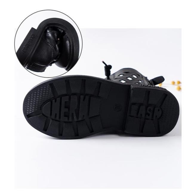 | 大人顔負けのオシャレなブーツサンダル。 バックファスナーデザインで脱ぎ履きがとっても簡単! 深い凹凸でグリップ力抜群!濡れた路面や室内でも滑りにくい。 | |
