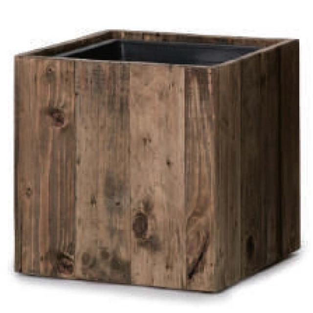 木目を引き立てる濃いブラウン色にステイン着色されたパイン材を使用。名前の通り、製材時出る家具や建材用には使われない節の多い部分をリサイクル(正確にはアップサイクル)して使っています。このパイン材はビンテージ感に溢れ、グリーンをセットすればカジュアルでリラックスできる空間を演出してくれます。インナーポットが付属されており、そのトップの張り出しを内側の一段下がった縁に吊り下がる形でインナーの見えにくい仕様に工夫されています。インナーは完全防水ですので鉢カバーとして使用でき、植物によっては直接植えこむことも可能です。ただ、キューブの大型2点は内側がジンク製ですので別途防水インナーをご用意ください。