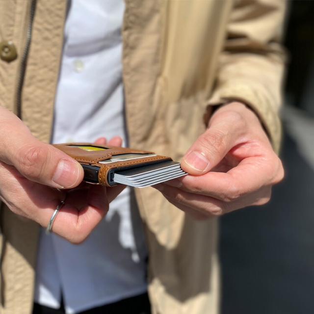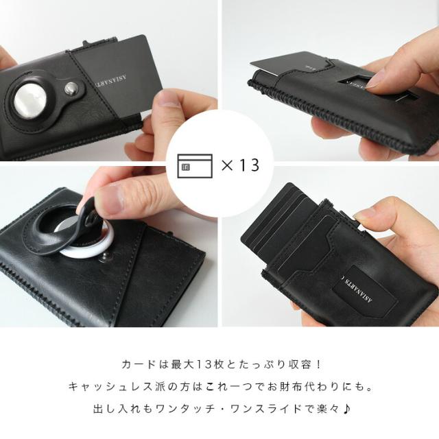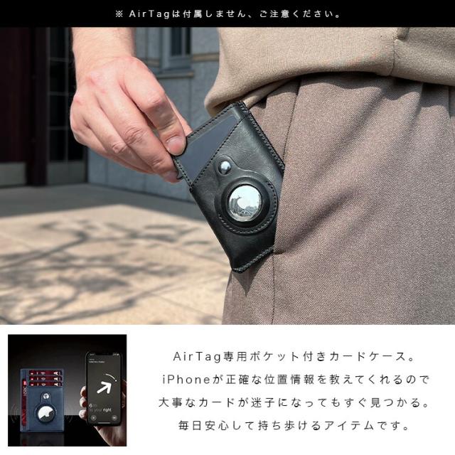 Apple社の紛失防止タグAirTag専用のポケットを備えたカードケースです。iPhoneが正確な位置情報を教えてくれるのでカードケースを落としてしまってもすぐに探し出すことができます。大事なカードがもし迷子になってもすぐに見つけられるので安心して大事なカード類を持ち歩くことができます。