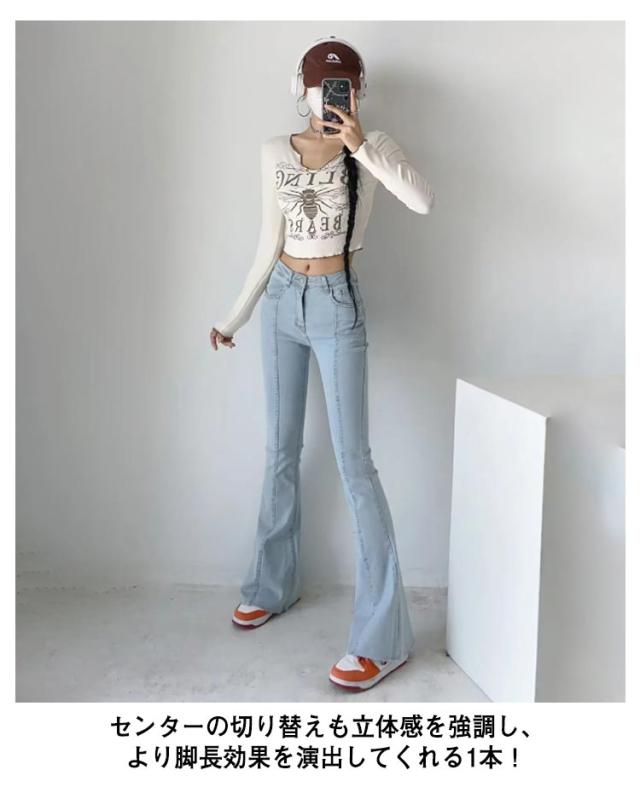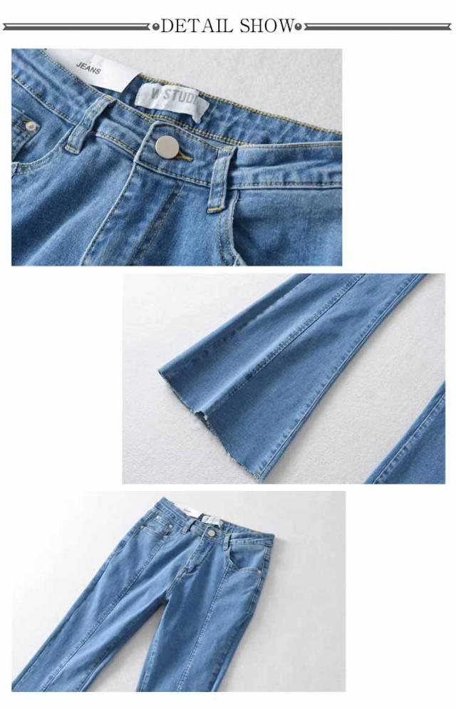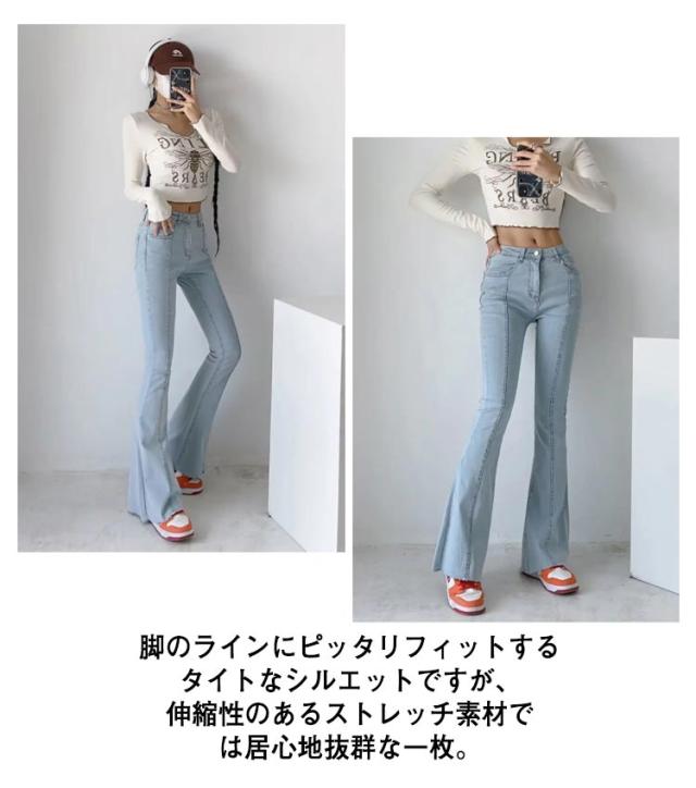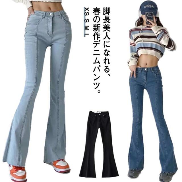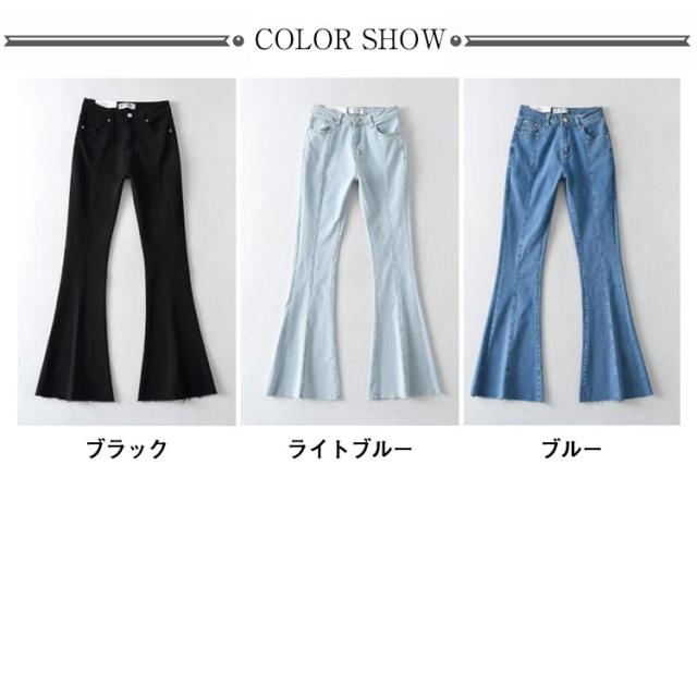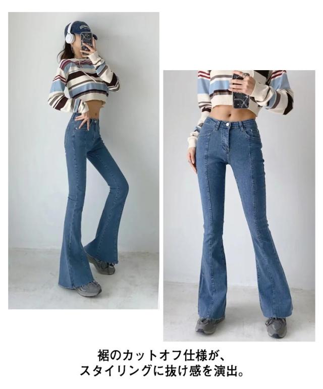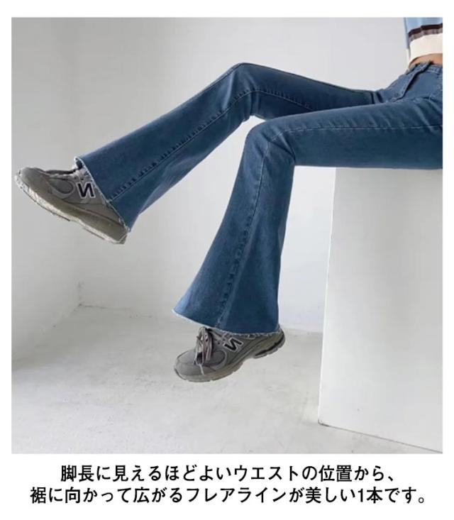 フレアパンツ デニムパンツ レディース カットオフ ストレッチ 美脚ライン 脚長効果 スリム 細身シルエット タイト ボトムス 裾切りっぱなし オールシーズン 無地 全3色