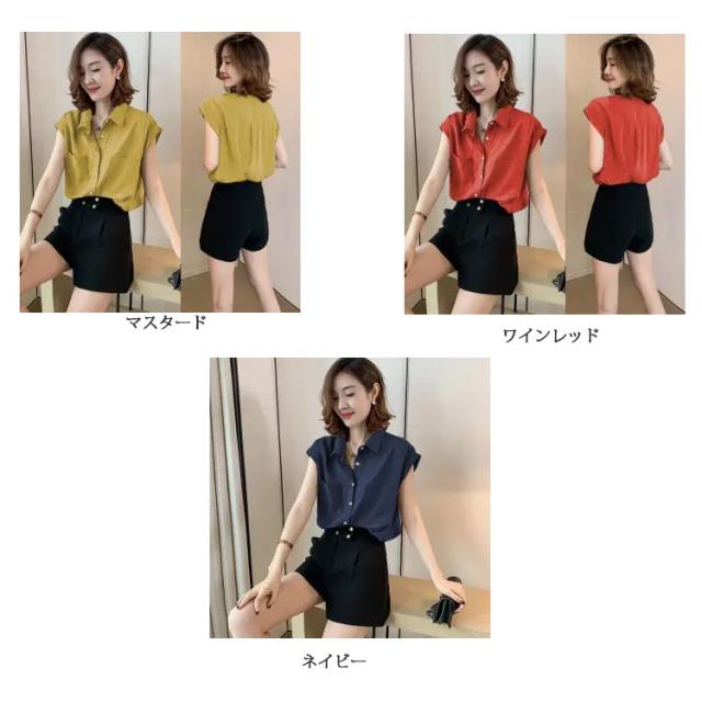 ブラウス フレンチスリーブ サファリシャツ レディース シャツノースリープ 袖なし 襟付き 胸ポケット シャツブラウス ミリタリー ボーイッシュ 送料無料 トップス 春 夏 半袖 シャツ オフィスカジュアル ロールアップスリーブ レギュラーカラー