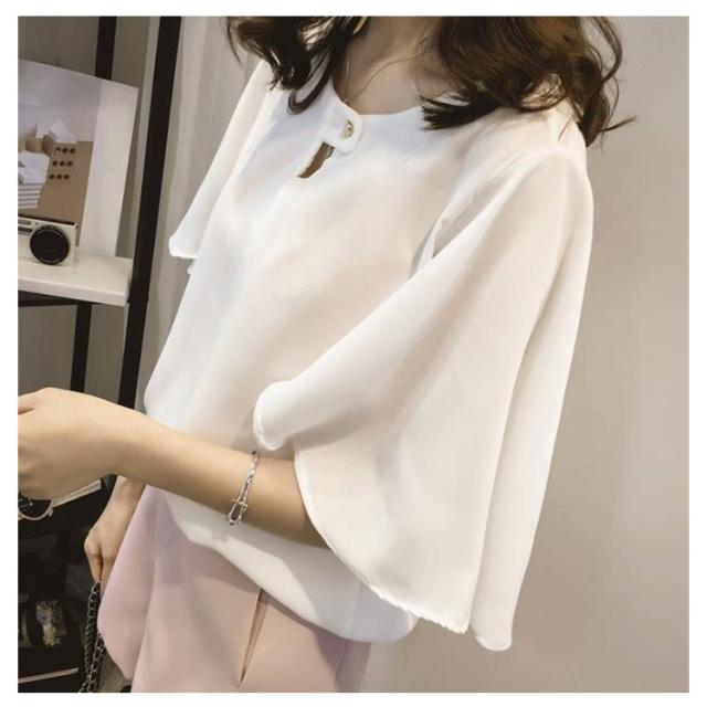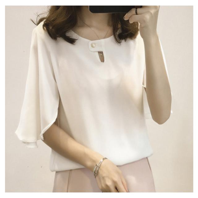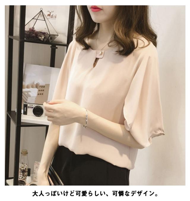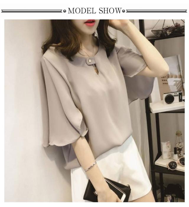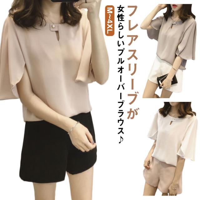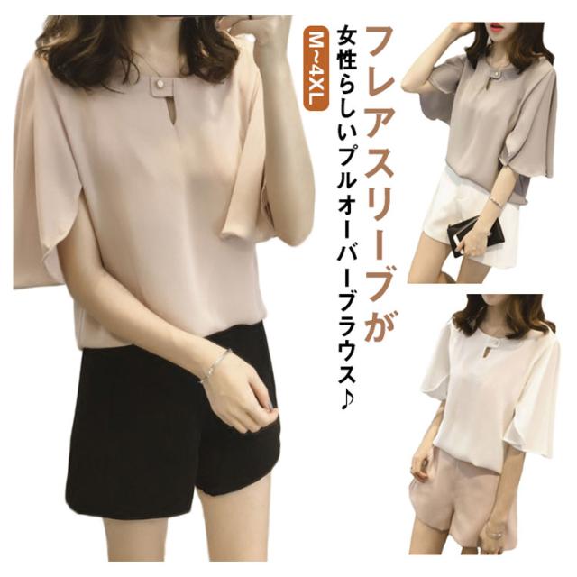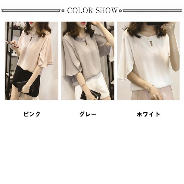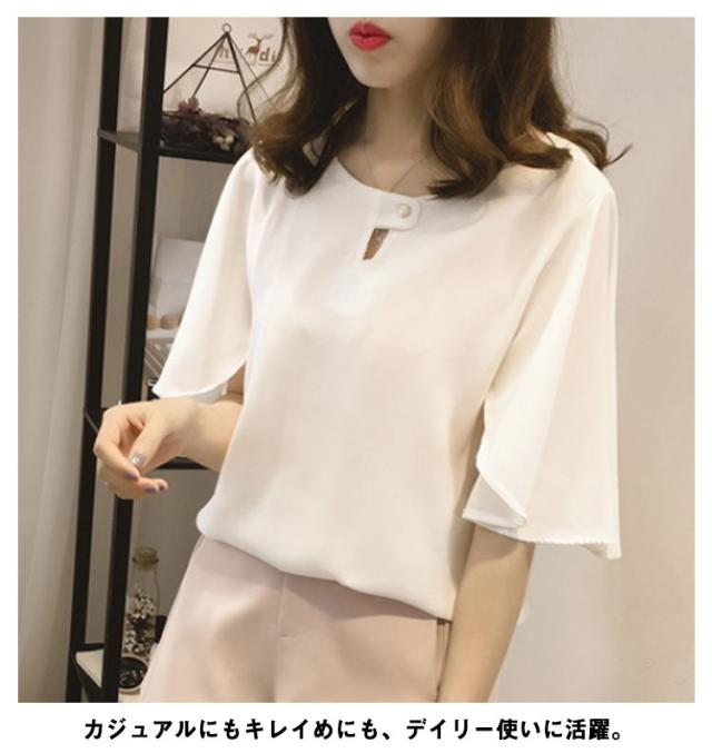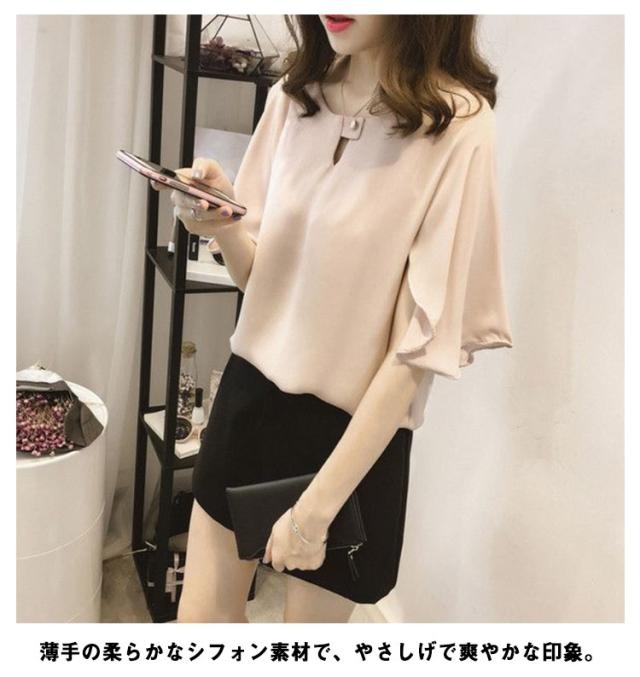 薄手 シフォン ブラウス 無地 5分袖 クルーネック フレアスリーブ プルオーバー 送料無料 シャツブラウス 半袖 トップス フリル レディース 春 夏 おしゃれ きれいめ カジュアル 着回し 仕事 上品 韓国ファッション