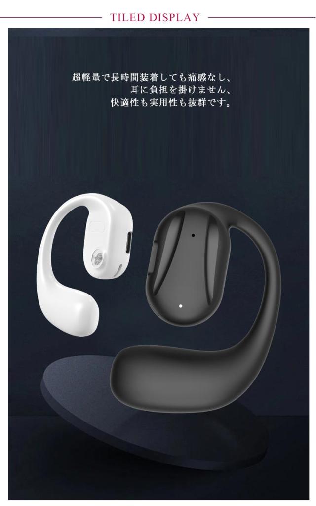 | 耳ラインに基づいた流線型の設計によって、左右耳とも快適な装着感をもたらします。 超軽量で長時間装着しても痛感なし、耳に負担を掛けません、快適性も実用性も抜群です。 通話や音楽を聞きながら、周囲の音を聞き取れるから安全運転をしっかりサポート。 IPX4防水仕様で、雨や汗に恐れず、スポーツに最適。 最新の5.2知能チップと搭載しており、通信スピードを向上させ、通信範囲も広げます。 【操作方法】 曲の切り替え:2回タッチ次の曲、3回タッチ前の曲; 音楽を一時停止/再生:ワンタッチ)、 通話出る:ワンタッチ、電話着る:2回タッチ、 通話拒否:長押し1.5秒、 siri:長押し1.5秒 | |