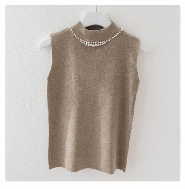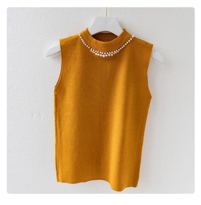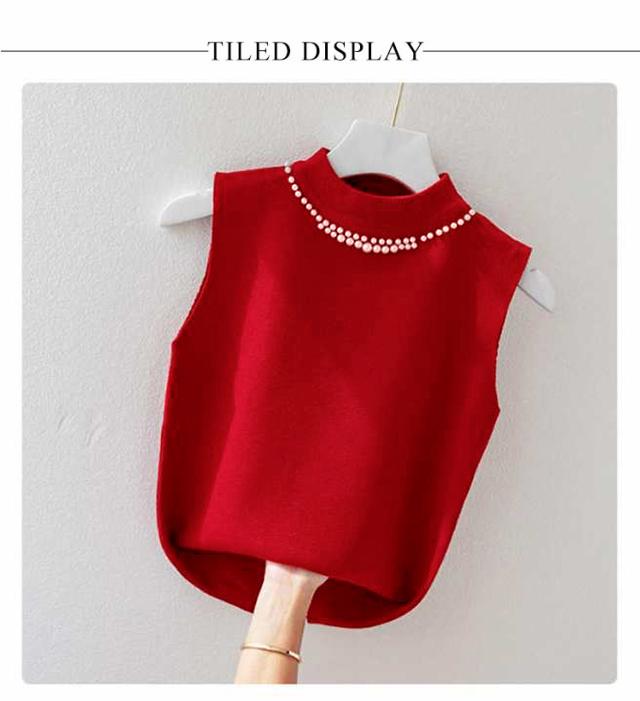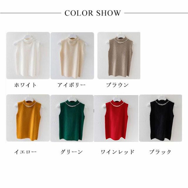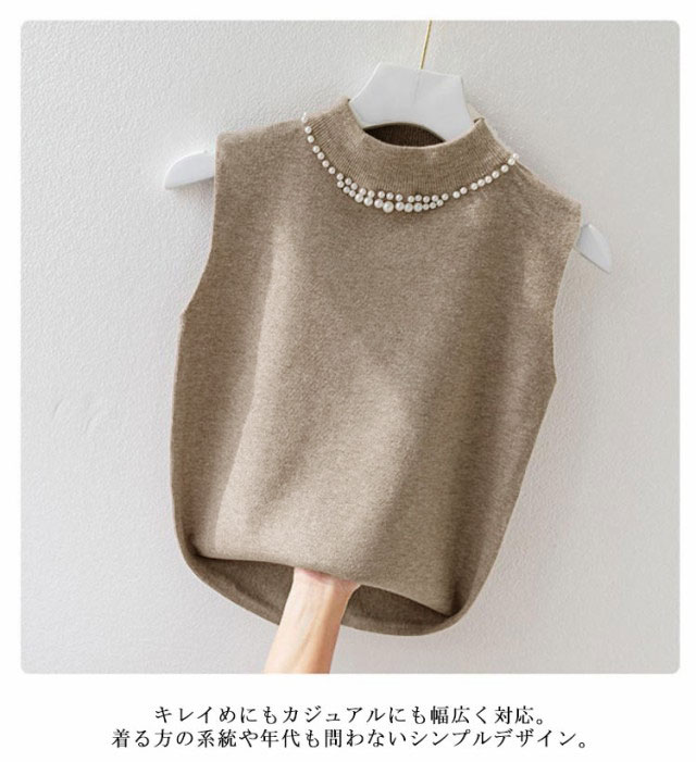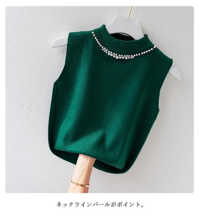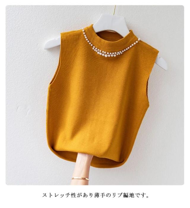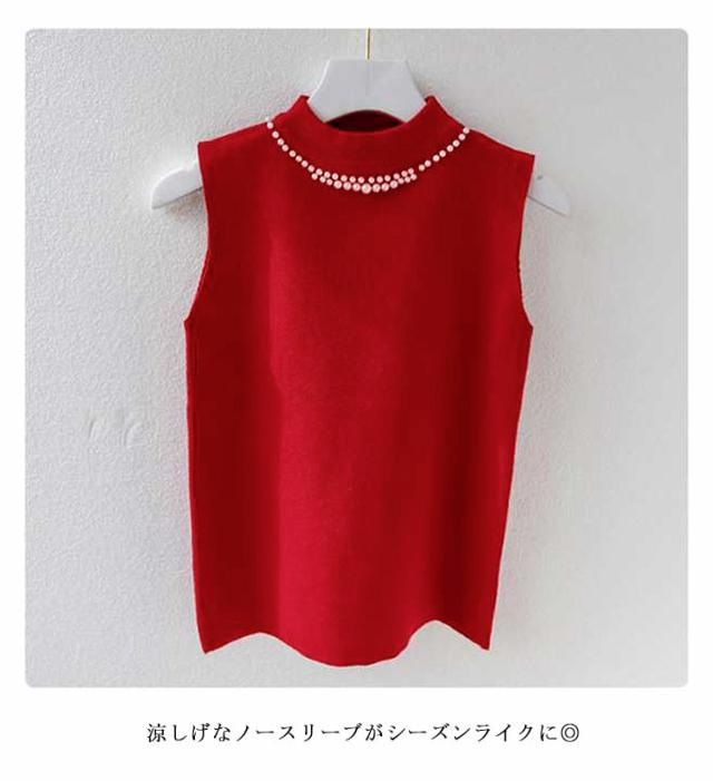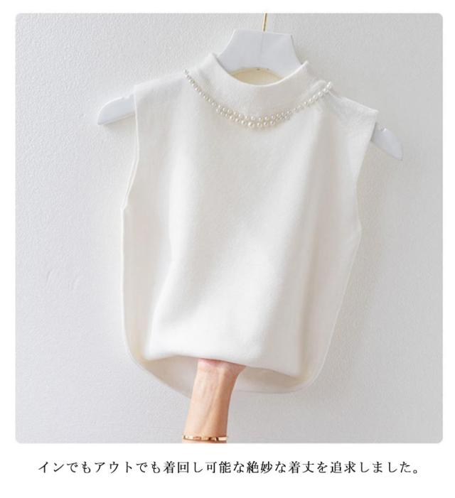 ノースリーブ ニットトップス リブニット パール付き ニットベスト トップス サマーニット ハイネック タートルネック スリム フィット 春 夏 秋 ニットタンクトップ 無地 フェミニン きれいめ 大人 通勤 20代 30代 40代 50代