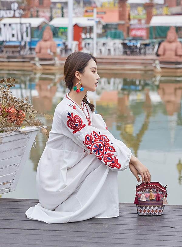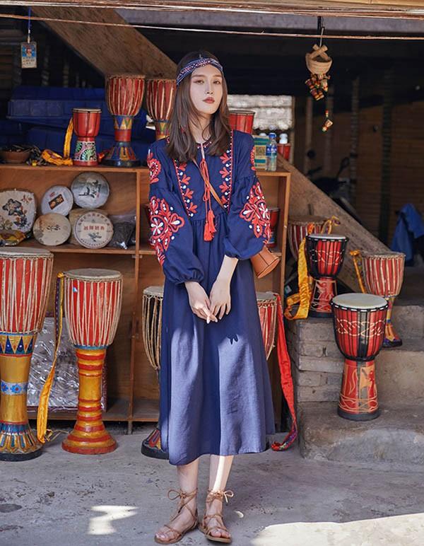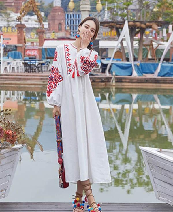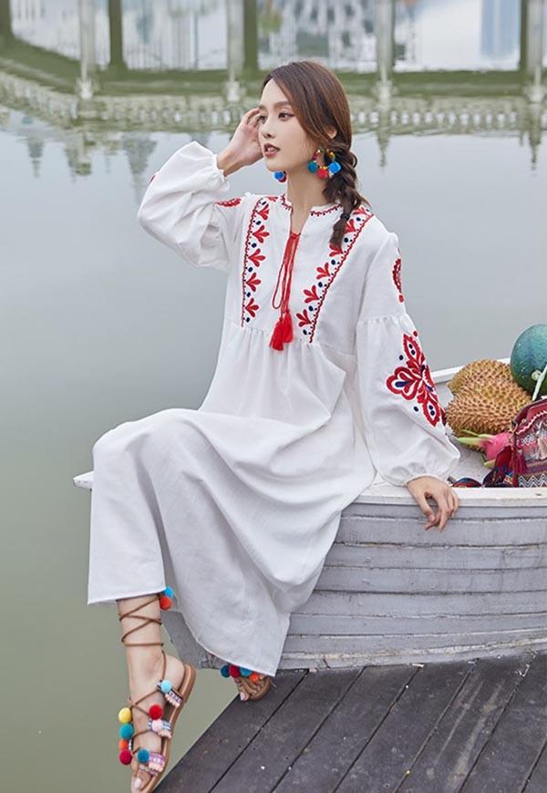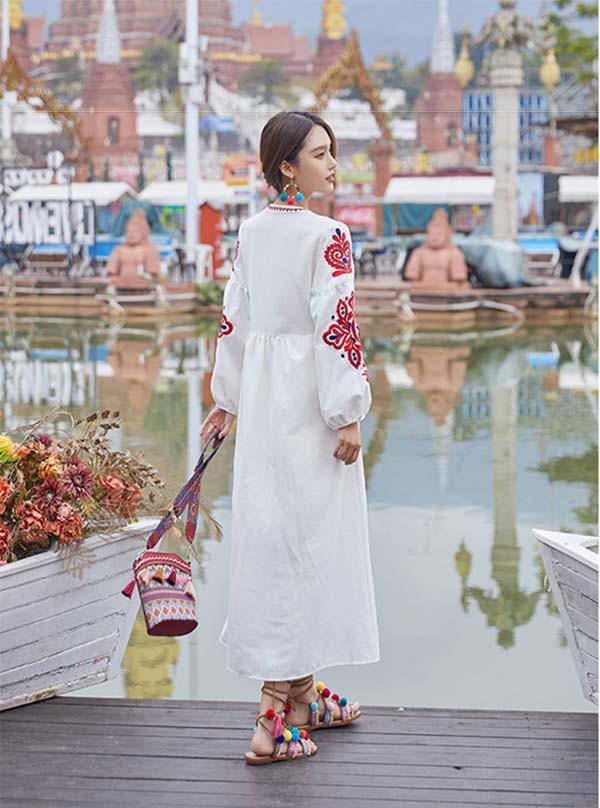 【レビュー投稿で+5%還元】ハワイ リゾートワンピース マキシ丈 長袖 体型カバー 大きめ ゆったり 刺繍 民族風 夏ワンピ ロングワンピース 沖縄 海外旅行 ホワイト ネイビー レディース マキシワンピース おしゃれ 大人可愛い