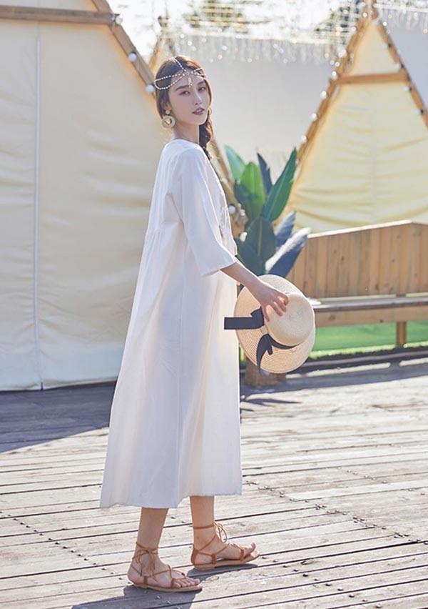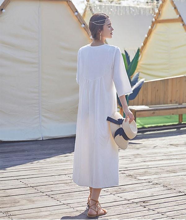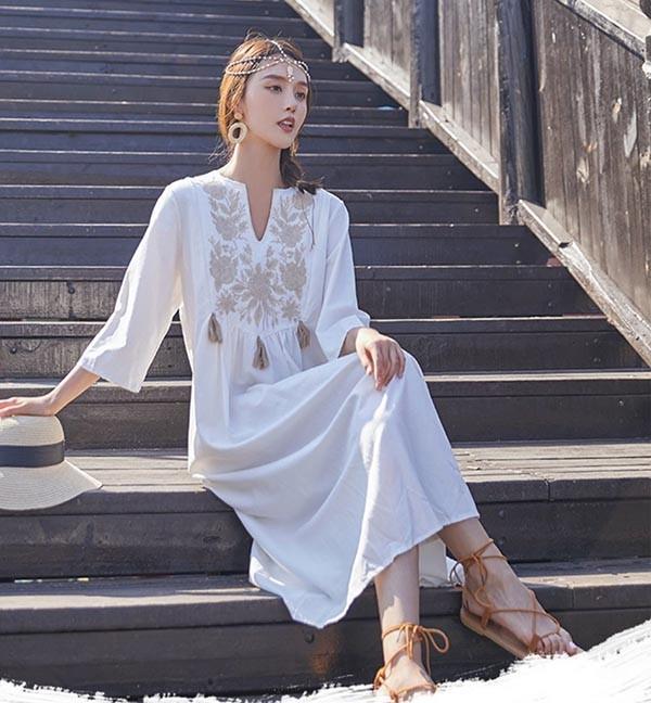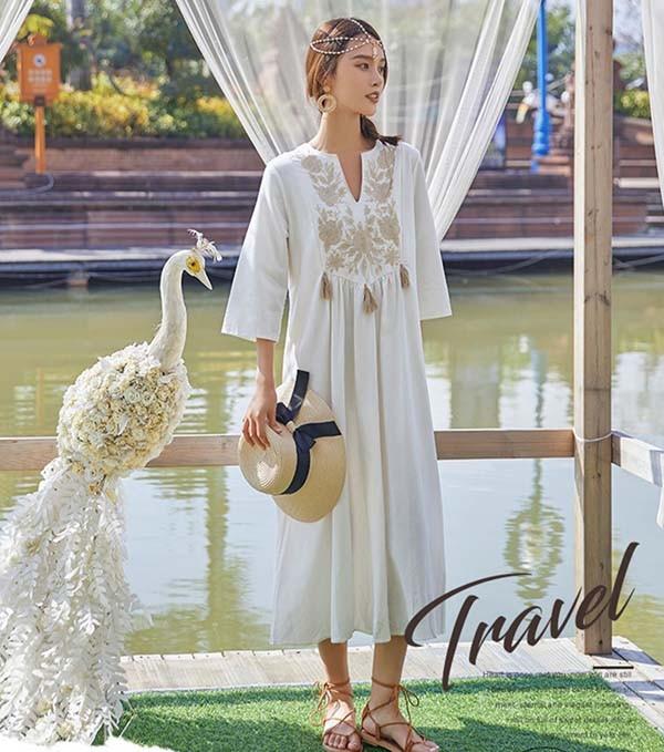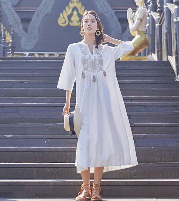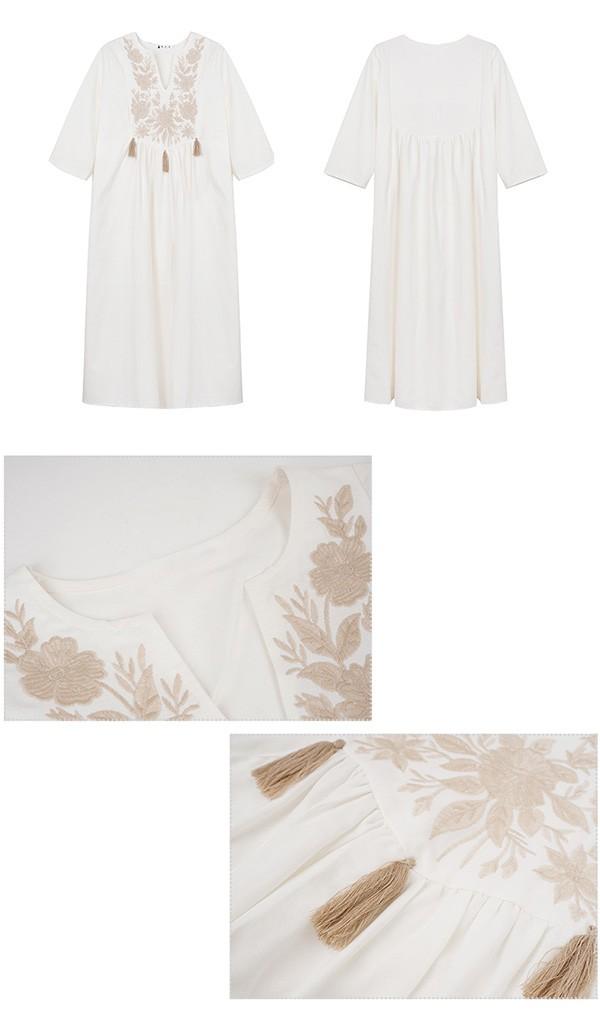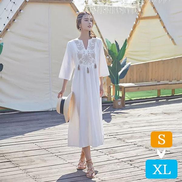 【レビュー投稿で+5%還元】ハワイ リゾートワンピース マキシ丈 七分袖 体型カバー 大きめ ゆったり 刺繍 民族風 夏ワンピ ロングワンピース 沖縄 海外旅行 ホワイト レディース マキシワンピース おしゃれ 大人可愛い
