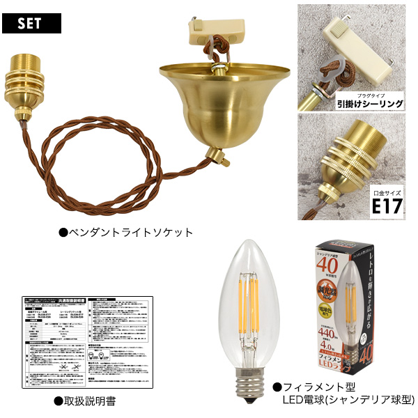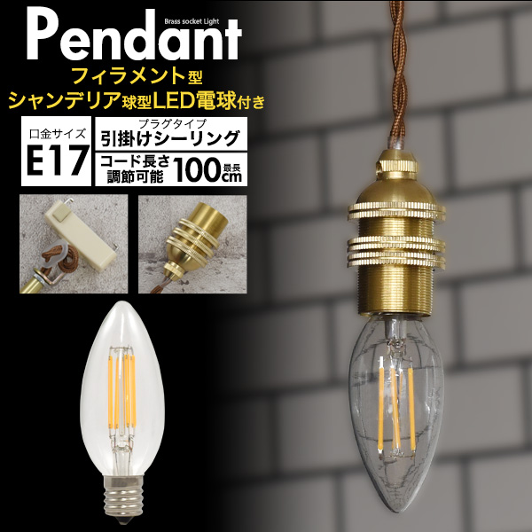 ペンダントライト E17 1灯 ビンテージ風 吊り下げ 照明器具 シャンデリア球 LED電球付き 真鍮 引掛けシーリングタイプ 電球セット 照明 おしゃれ 裸電球 レールライト ダクトレール用 天井照明 レトロかわいい おしゃれ照明 器具 アンティーク調 スポットライト器具