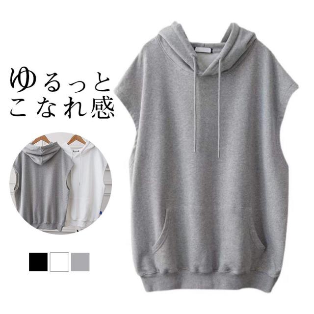 ベスト レディース 夏服 袖なし プルオーバー ジレ ノースリーブ フード付き ゆったり トレーナーパーカー 重ね着 レイヤード