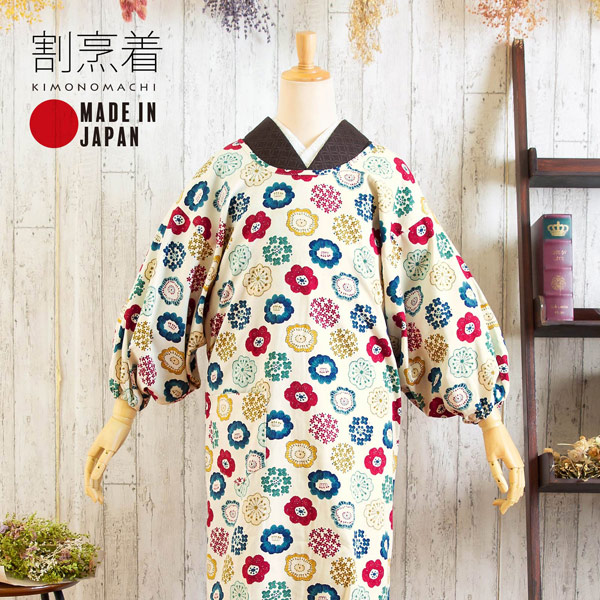ロング丈 割烹着「生成り色 編み物風のお花」 実用的 日本製 オシャレ かわいい 綿割烹着 ロング割烹着 着物割烹着 エプロン プレゼント最適品 【送料無料】【メール便不可】