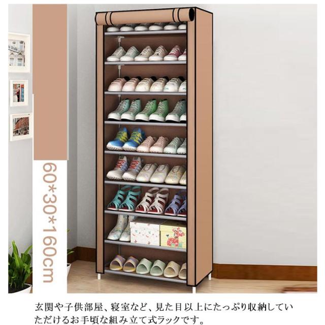 | 省スペースながらも、高さを利用してたっぷり容量となっております。 ご家族の靴やオフシーズンの靴も箱ごとまとめて収納できます。 カバーは通気性のある不織布素材を使い、水に強く、湿気や臭いがこもるを軽減してくれます。 巻き上げてカバーを固定できて、ゆっくり靴を選びたい時やラックの中を掃除する時にも便利です。 シューズラックだけではなく、収納棚としてもOK! 玄関や子供部屋、寝室など、見た目以上にたっぷり収納していただけるお手頃な組み立て式ラックです。 | |